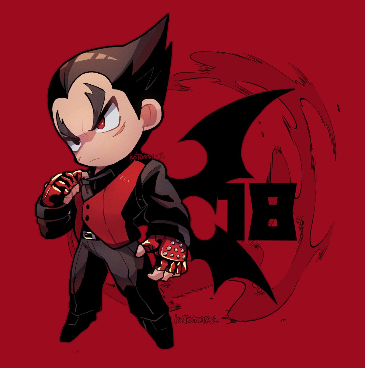 1boy adjusting_clothes adjusting_necktie belt black_belt black_hair black_pants black_shirt black_wings chibi chibi_only closed_mouth facial_scar fingerless_gloves full_body gloves heterochromia highres kotomaru_(kotokoto_kottan) long_sleeves male_focus mishima_kazuya necktie no_nose pants red_background red_eyes red_gloves red_vest scar scar_on_cheek scar_on_face shirt short_hair sideburns signature solo studded_gloves tekken v-shaped_eyebrows vest wings
