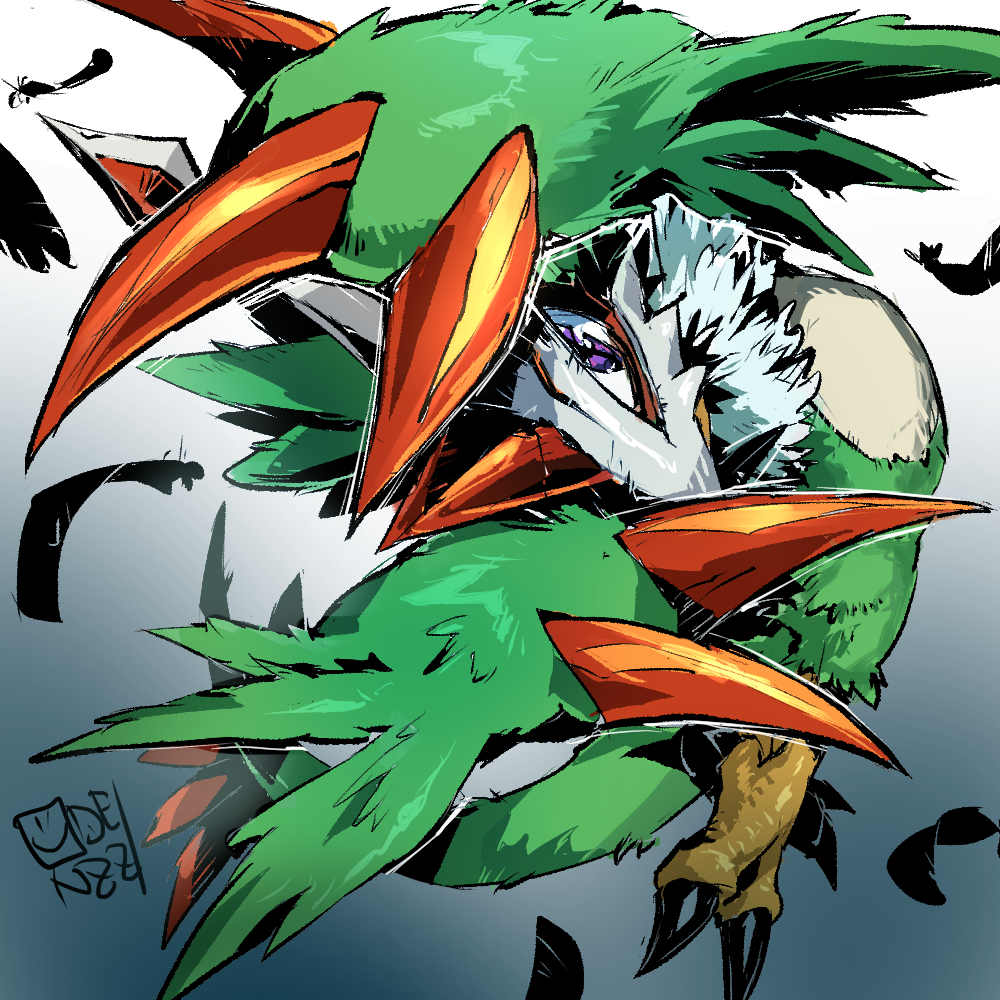 bird collarbone commentary_request digimon digimon_(creature) digimon_liberator dragon eye_mask feathers full_body gradient_background green_feathers green_tail horns mask oden_(odenzzi) pteromon purple_eyes single_horn sketch solo