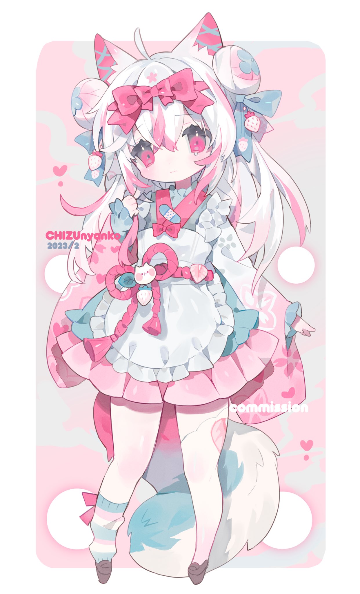 1girl ahoge animal_ear_fluff animal_ears apron asymmetrical_legwear blue_bow bow brown_shoes chizunyanko closed_mouth double_bun fox_ears fox_girl fox_tail frilled_apron frills full_body hair_between_eyes hair_bow hair_bun hand_up heart highres japanese_clothes kimono long_hair long_sleeves looking_at_viewer mismatched_legwear multicolored_hair original pink_bow pink_eyes pink_hair pink_skirt pleated_skirt shoes single_sock single_thighhigh skirt sleeves_past_wrists socks solo standing streaked_hair striped_clothes tail thighhighs white_apron white_hair wide_sleeves
