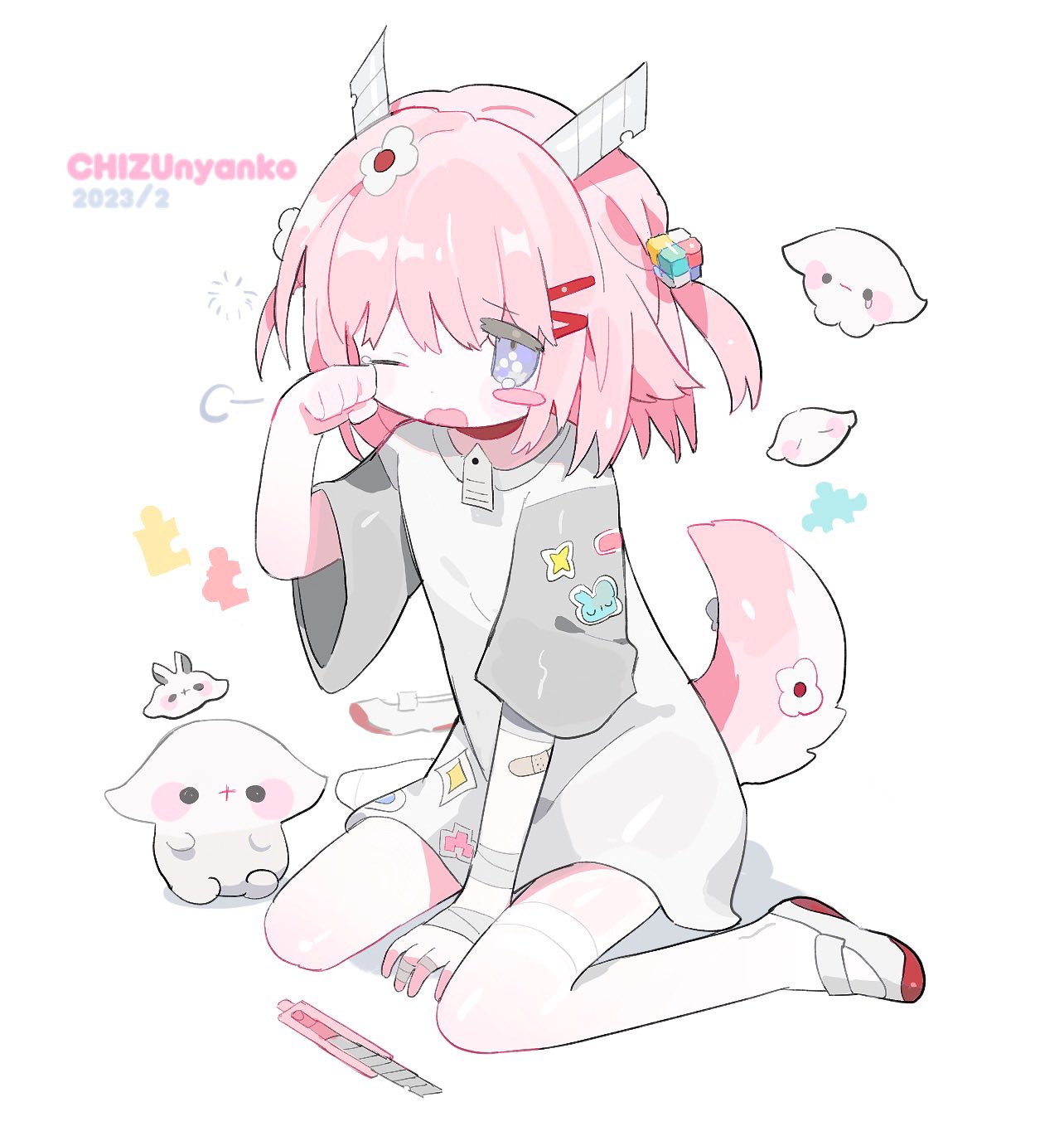 >_o 1girl animal_ears bandaged_arm bandaged_leg bandages bandaid bandaid_on_arm bandaid_on_leg between_legs blush_stickers boxcutter chizunyanko cube_hair_ornament dated dress egg_hair_ornament fang food-themed_hair_ornament full_body hair_ornament hairclip hand_between_legs hand_up highres horns looking_at_viewer medium_hair one_eye_closed open_mouth original pink_hair purple_eyes rubbing_eyes self-harm shirt shoes short_sleeves simple_background sitting solo tail tears thighhighs two_side_up uwabaki wariza white_background white_shoes white_thighhighs wing_hair_ornament