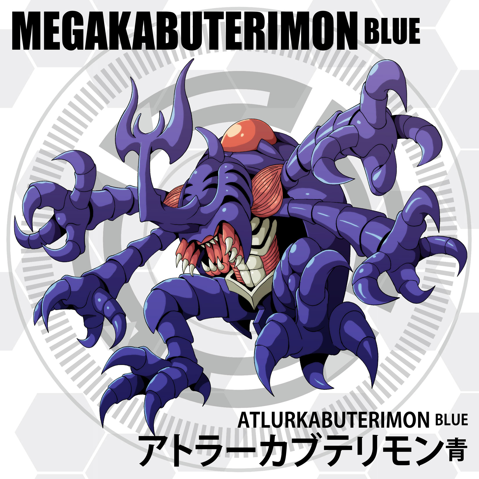atlurkabuterimon atlurkabuterimon_(blue) bug digimon digimon_(creature) exoskeleton highres horns rhinoceros_beetle sharp_teeth teeth