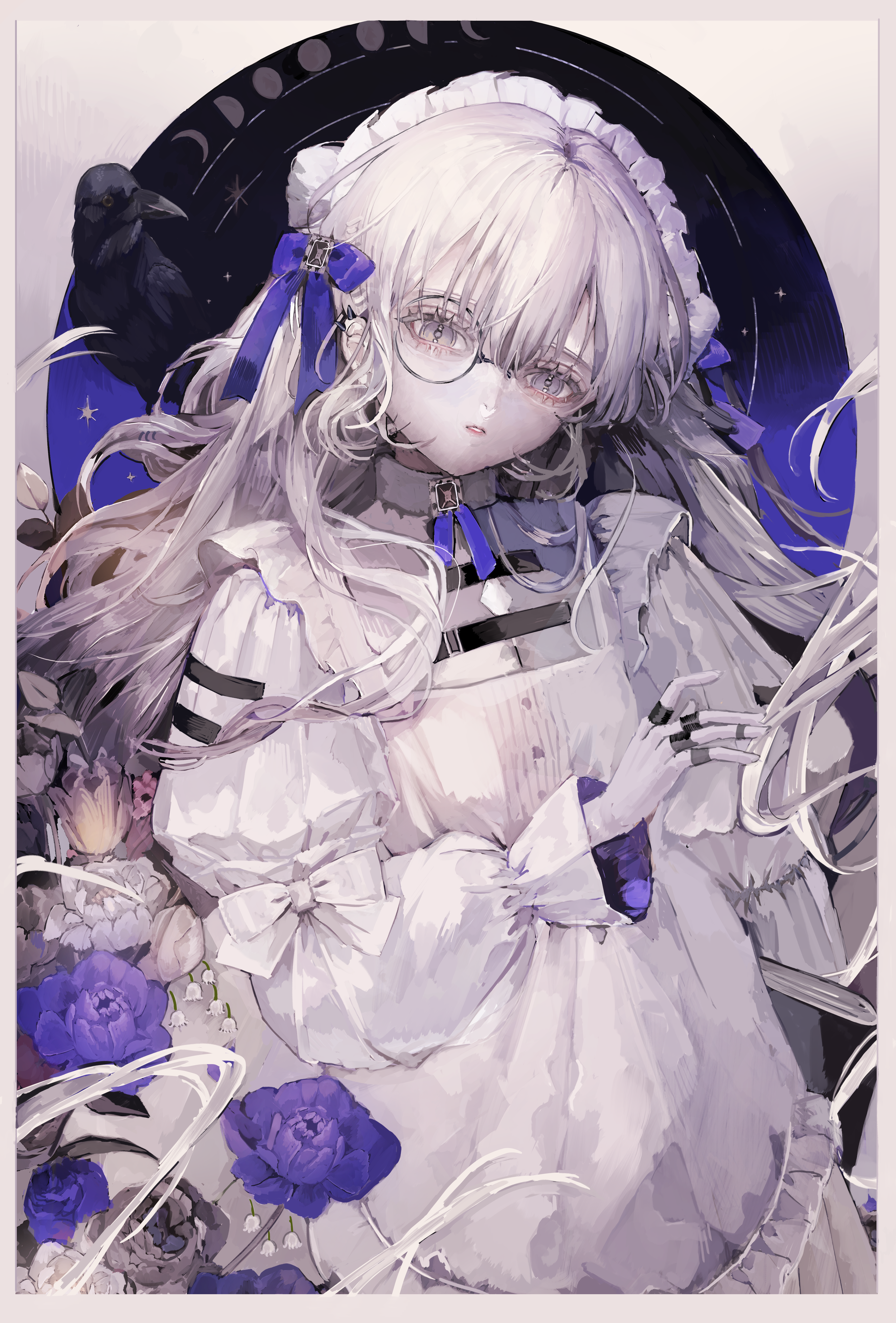 1girl absurdres aegyo_sal black_gem bow choppy_bangs curly_hair dress ear_piercing eyelashes flower frills gem glasses gradient_hair grey_eyes grey_hair hair_between_eyes hair_bow hair_ornament hair_over_shoulder hand_up head_tilt highres isshiki_shime jewelry leaf lily_of_the_valley long_hair long_sleeves looking_at_viewer monocle moon moon_phases multicolored_hair night original parted_lips piercing pink_flower puffy_sleeves purple_bow purple_flower ring sidelocks sky solo solo_focus star_(symbol) very_long_hair white_bow white_dress white_flower white_hair