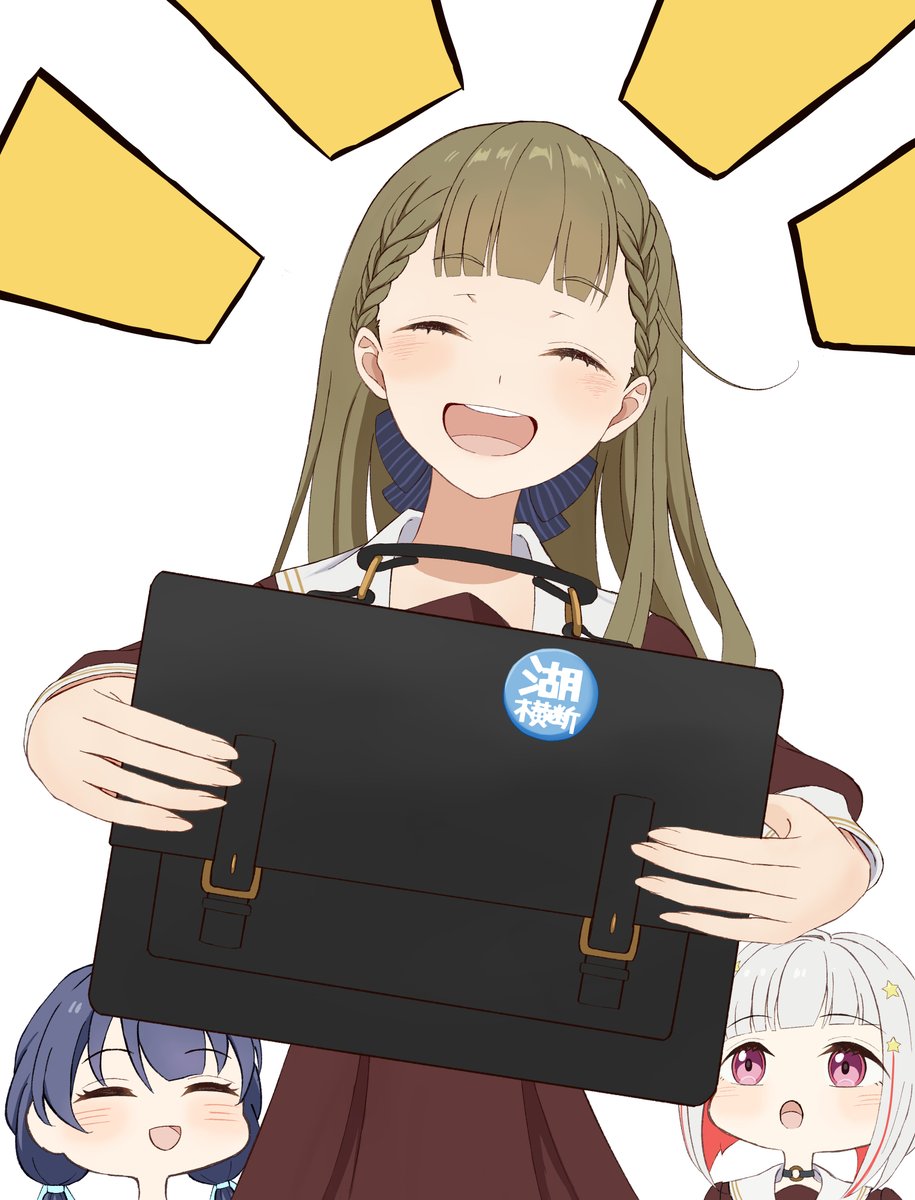 3girls :o ^_^ badge bag black_bag black_bow black_choker blue_hair blue_ribbon bob_cut bow braid brown_dress brown_hair button_badge center-flap_bangs chibi chibi_inset choker closed_eyes colored_inner_hair commentary dark_blue_hair diagonal_bangs dress grey_hair hair_bow hair_ornament hair_ribbon happy hasu_no_sora_school_uniform highres holding holding_bag inverted_bob kachimachi_kosuzu link!_like!_love_live! long_hair long_sleeves looking_at_another love_live! low_twintails multicolored_hair multiple_girls murano_sayaka notice_lines o-ring o-ring_choker open_mouth pink_eyes pleated_dress red_hair ribbon sailor_collar sailor_dress school_bag school_uniform short_hair side_ahoge side_braids smile solo_focus star_(symbol) star_hair_ornament straight_hair streaked_hair striped_bow translation_request twintails virtual_youtuber wachida_01d white_background white_sailor_collar winter_uniform yugiri_tsuzuri