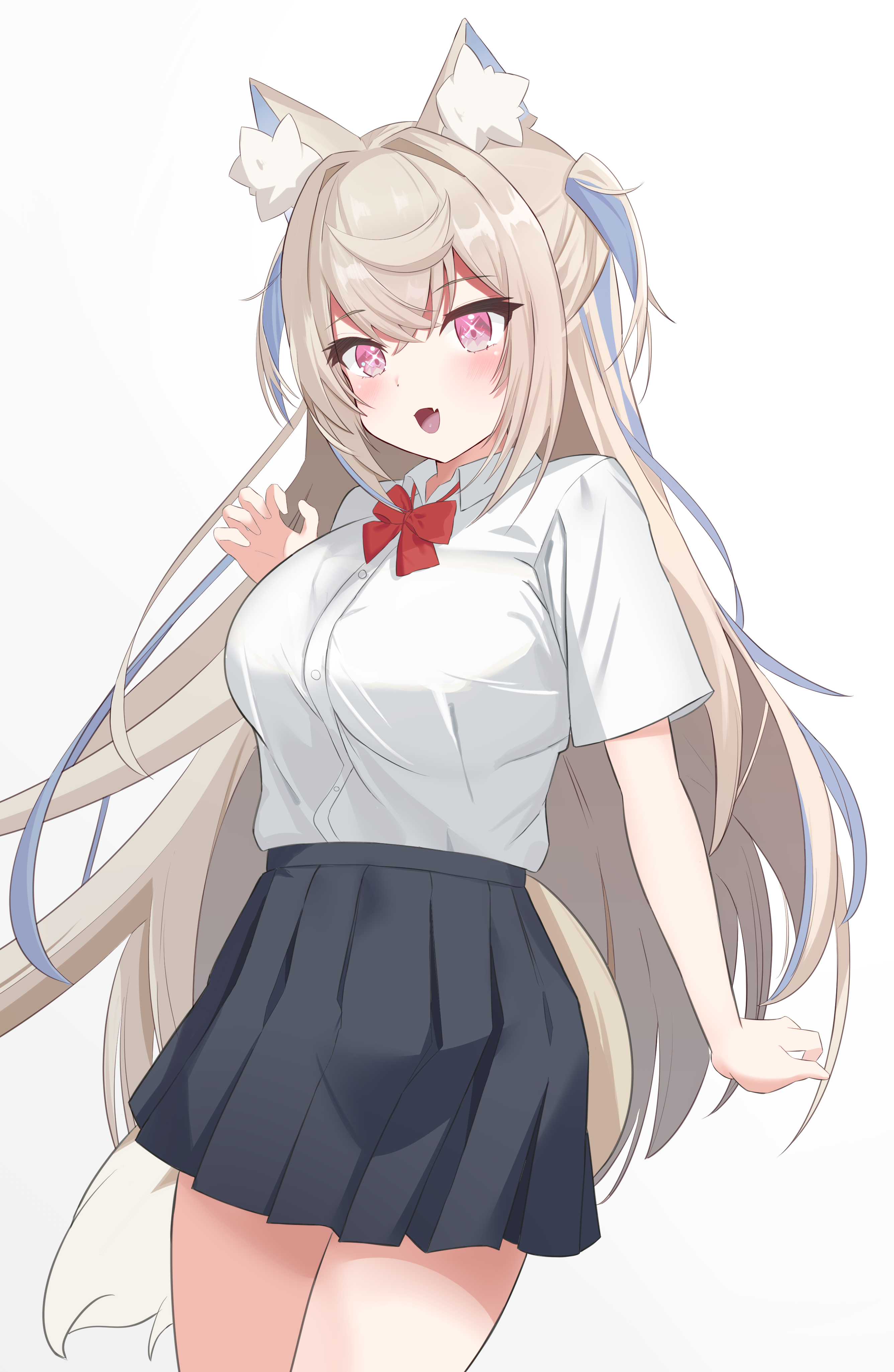 1girl absurdres alternate_costume animal_ear_fluff animal_ears black_skirt blonde_hair blue_hair blush collared_shirt dog_ears dog_girl dog_tail fang fuwawa_abyssgard highres hololive hololive_english long_hair looking_at_viewer multicolored_hair open_mouth pink_eyes sasaki_ikuya shirt skin_fang skirt smile solo streaked_hair tail two_side_up virtual_youtuber white_background white_shirt