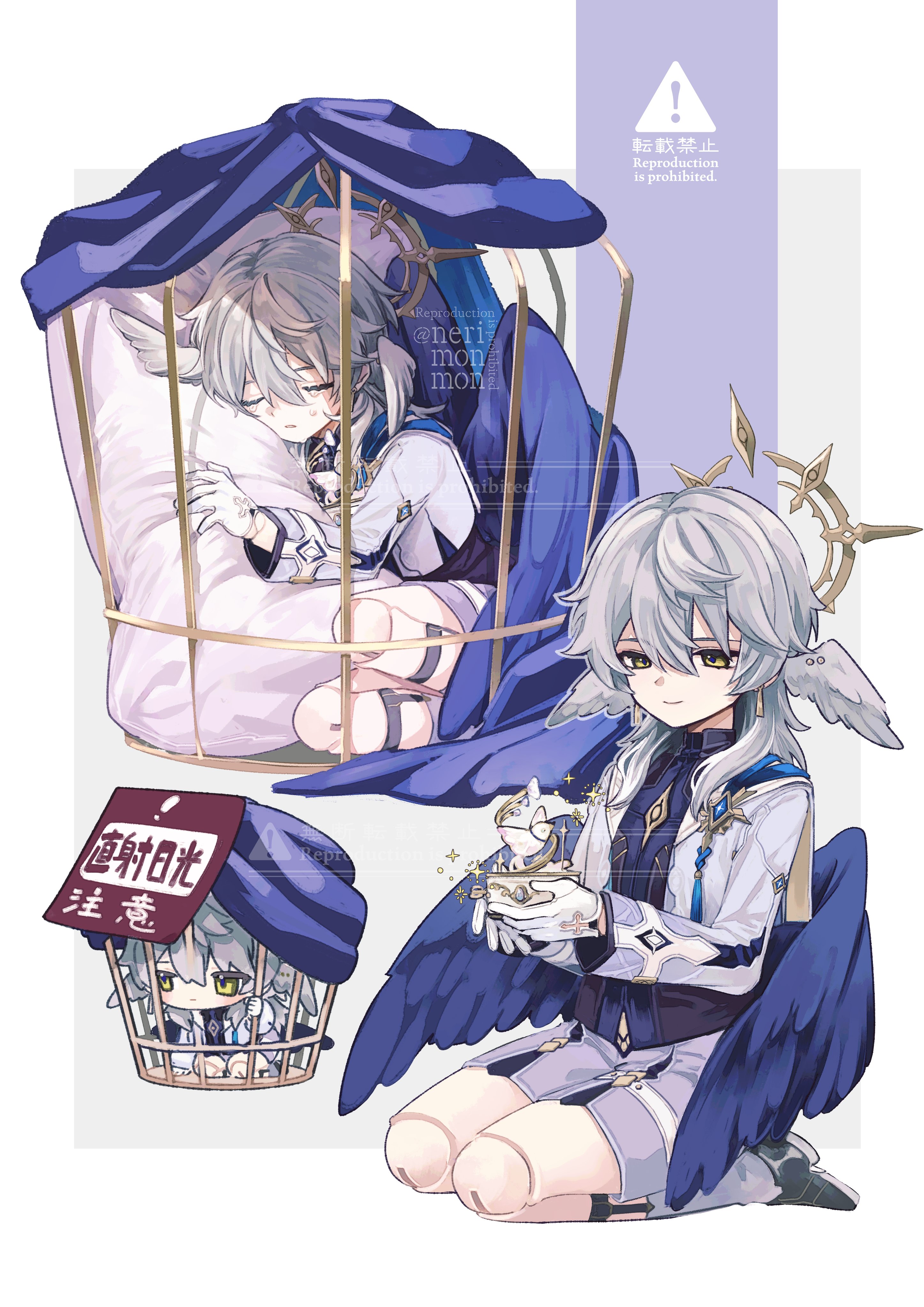 1boy absurdres birdcage blue_wings cage closed_mouth doll_joints gloves grey_hair grey_shorts halo head_wings highres honkai:_star_rail honkai_(series) jacket joints long_sleeves low_wings male_focus medium_hair multiple_views music_box nerimono_(nekokoban22) pillow shorts sitting sleeping sunday_(honkai:_star_rail) sunday_(sacerdos'_relived_ordeal)_(honkai:_star_rail) translation_request wariza white_gloves white_jacket wings yellow_eyes