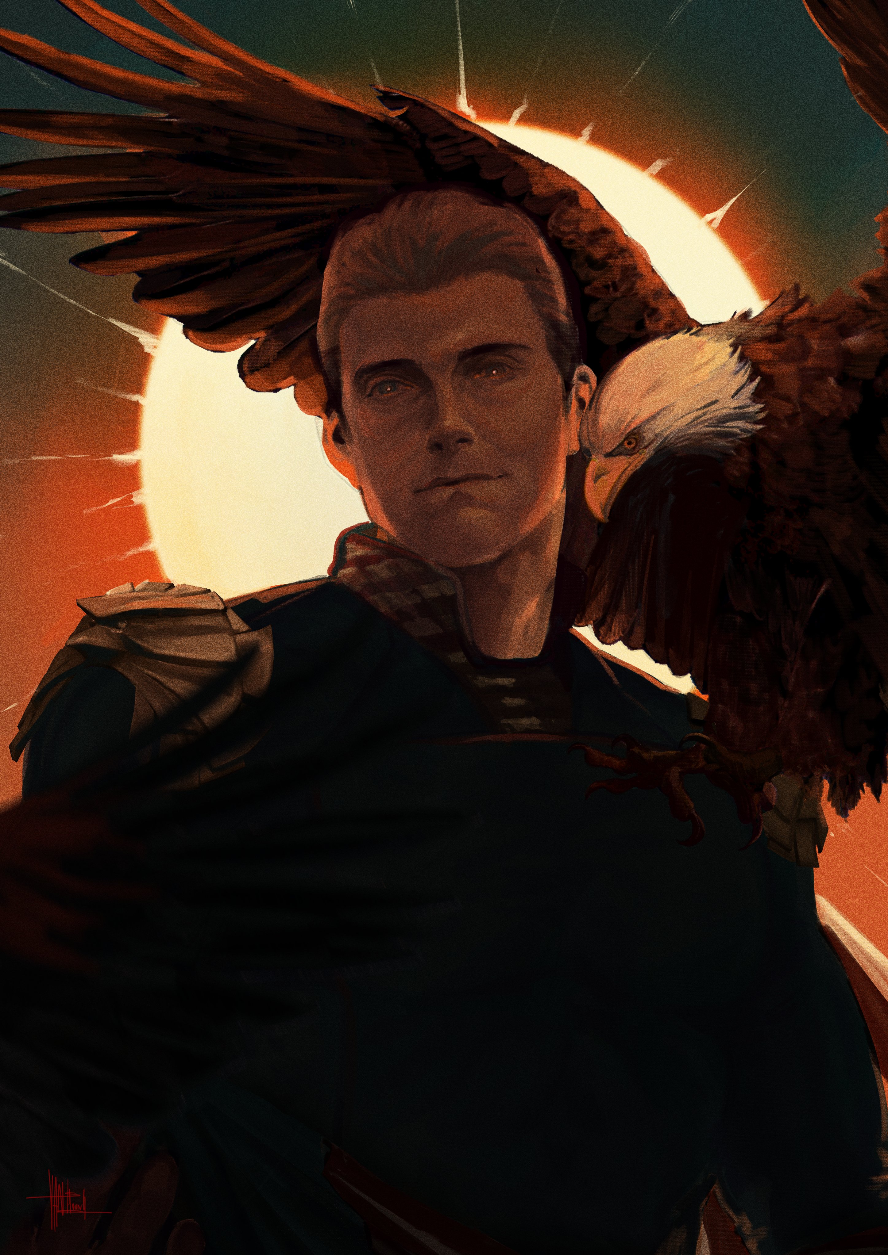 1boy absurdres bird closed_mouth commentary eagle english_commentary highres homelander looking_at_viewer male_focus muscular muscular_male outdoors pet solo sunset the_boys upper_body vanshoundd