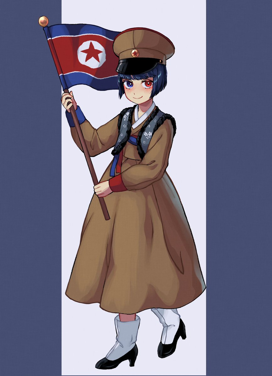 black_footwear blue_eyes blue_hair blunt_bangs blush bob_cut brown_dress brown_hat closed_mouth commentary_request dress flag full_body hat heterochromia high_heels highres holding holding_flag holding_pole inverted_bob korean_clothes kuroussa long_sleeves north_korea_(kuroussa) north_korean_flag original peaked_cap personification pole red_eyes short_hair smile standing white_footwear