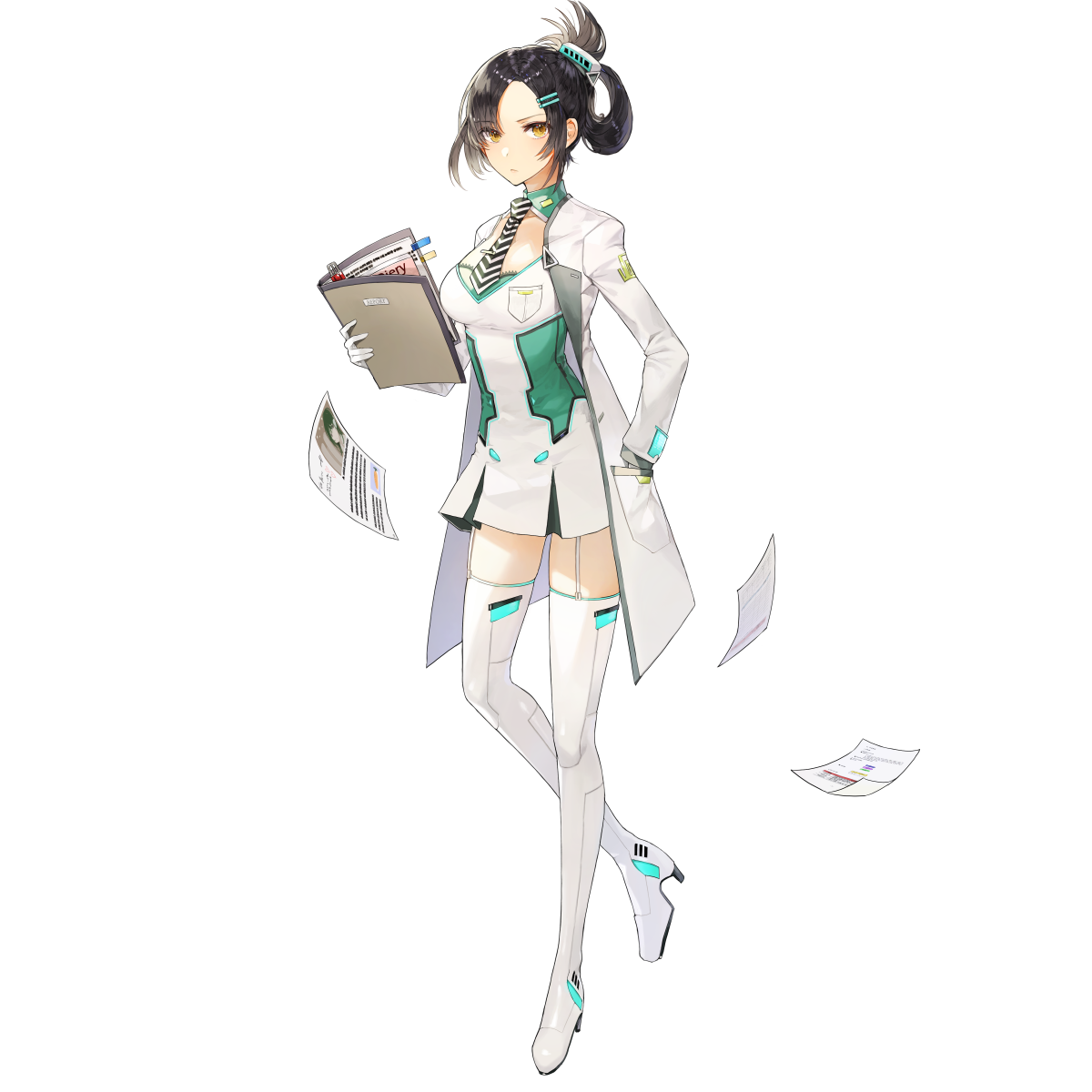 1girl artist_request boots breast_pocket breasts collar dress falling_paper final_gear folder full_body garter_straps gloves green_collar hair_ornament hairclip half_updo hand_in_pocket highres holding holding_folder light_frown long_sleeves looking_at_viewer medium_breasts necktie nizzy_(final_gear) official_art paper pleated_dress pocket simple_background solo tachi-e thigh_boots third-party_source tie_clip transparent_background two-tone_dress two-tone_necktie white_boots white_dress white_garter_straps white_gloves white_sleeves yellow_eyes