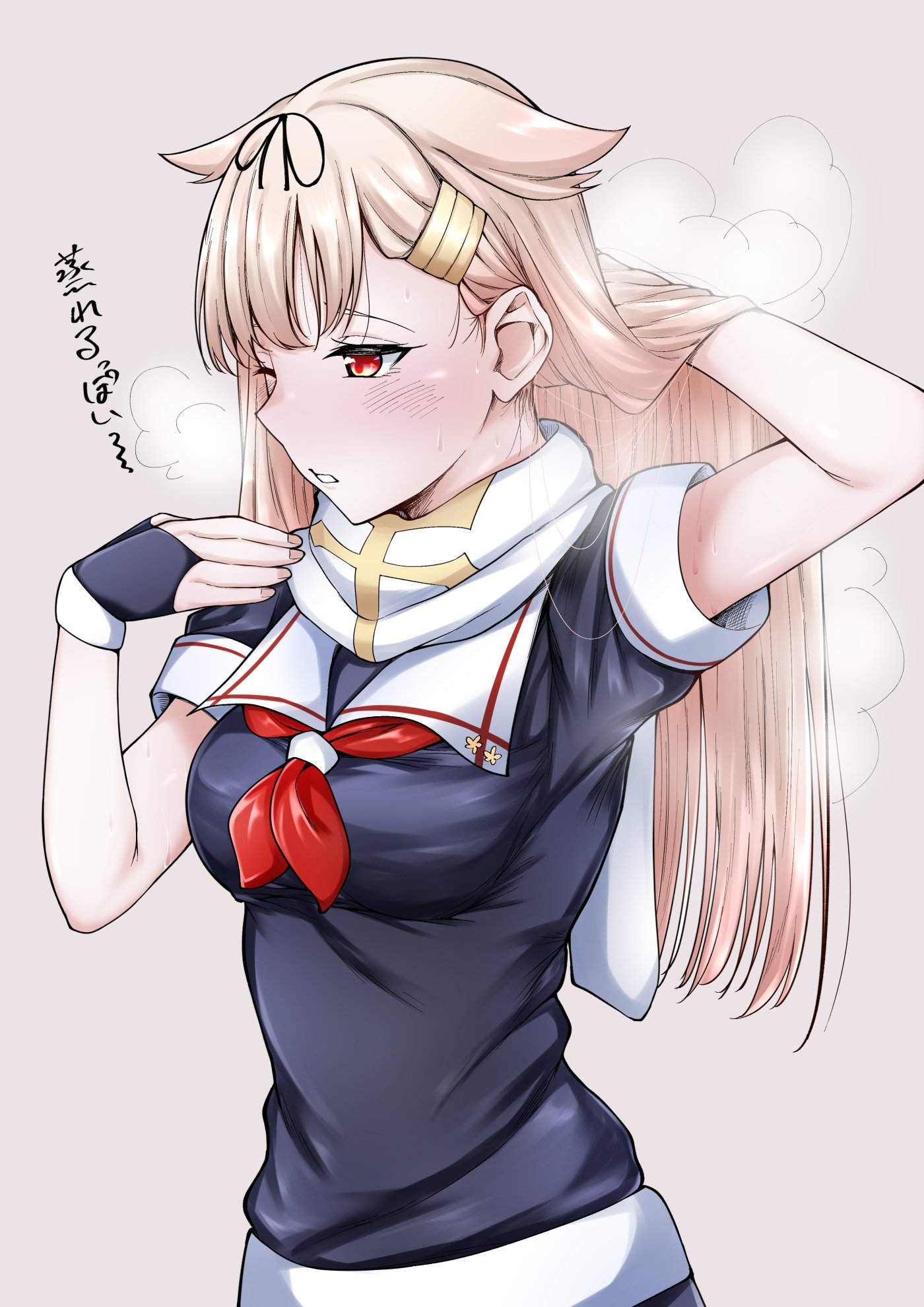 1girl black_gloves black_serafuku black_shirt blonde_hair breath commentary_request gloves grey_background hair_flaps hair_ornament hairclip highres kantai_collection long_hair neckerchief poi_(phrase) red_eyes red_neckerchief rikkii_(likito_yuzu_is) sailor_collar scarf school_uniform serafuku shirt simple_background solo white_sailor_collar white_scarf yuudachi_(kancolle) yuudachi_kai_ni_(kancolle)