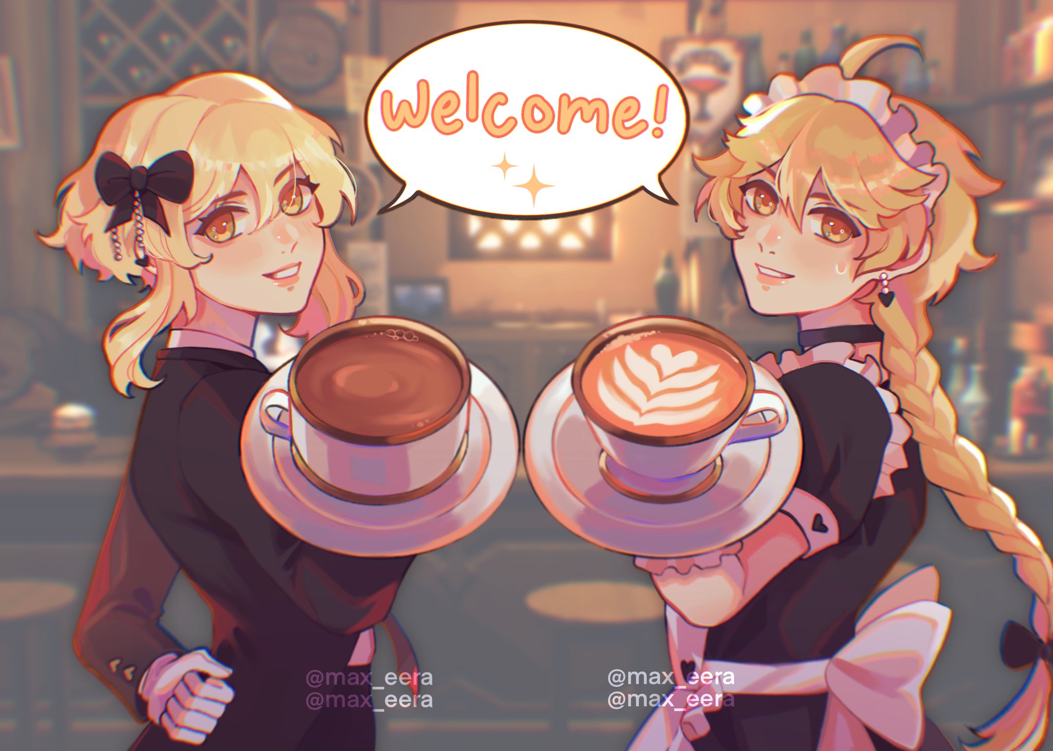 1boy 1girl aether_(genshin_impact) ahoge alternate_costume apron arm_behind_back artist_name back_bow black_bow black_choker black_dress black_jacket black_necktie blonde_hair bottle bow braid brother_and_sister brown_eyes buttons cappuccino chair choker clenched_hand coffee commentary crossdressing cup dress earrings english_commentary english_text formal_clothes frills from_side genshin_impact gloves hair_between_eyes hair_bow hand_up heart heart_button heart_earrings heart_print highres holding holding_plate indoors jacket jewelry lips long_hair long_sleeves looking_at_viewer lumine_(genshin_impact) maid maid_headdress max_eera necktie open_clothes open_jacket plate puffy_short_sleeves puffy_sleeves shirt short_hair short_sleeves siblings sidelocks smile sparkle speech_bubble standing suit sweatdrop table teeth watermark white_apron white_bow white_gloves white_shirt window