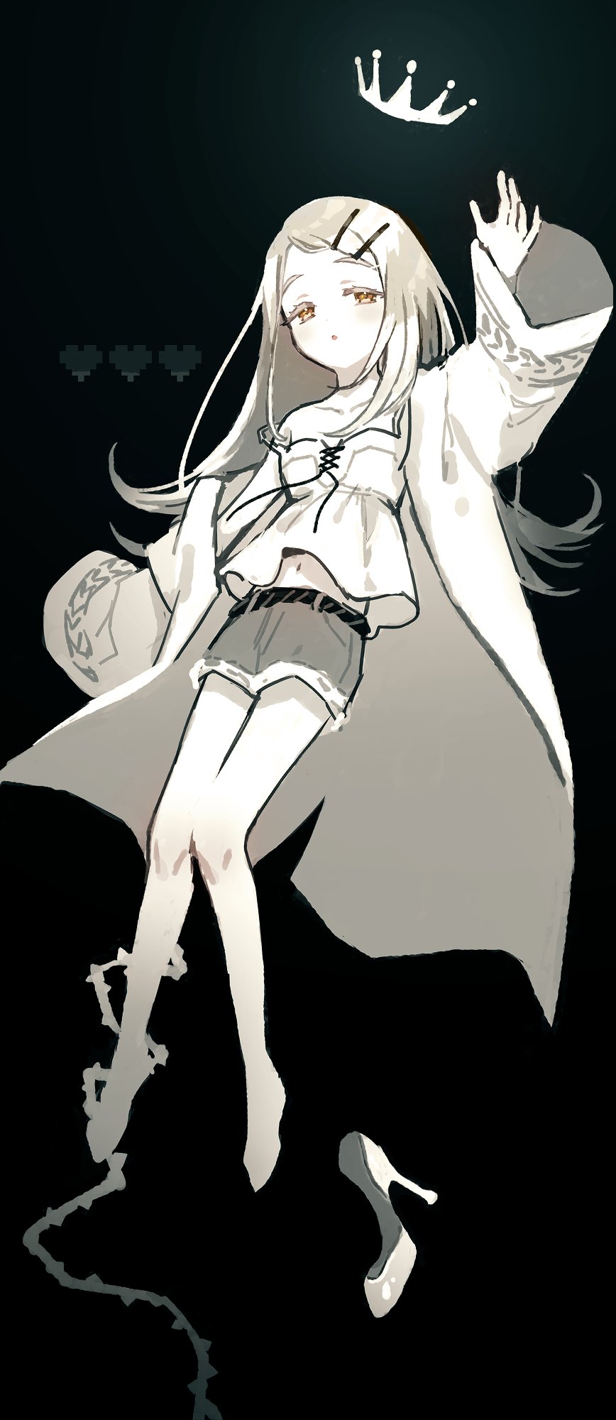 1girl arm_up black_background camisole crown denim denim_shorts expressionless full_body gakuen_idolmaster health_bar heart high_heels highres idolmaster jacket long_hair looking_at_viewer monochrome navel open_clothes open_jacket orange_eyes plant shinosawa_hiro shoes shorts simple_background sketch solo spot_color ting_come unworn_shoes vines