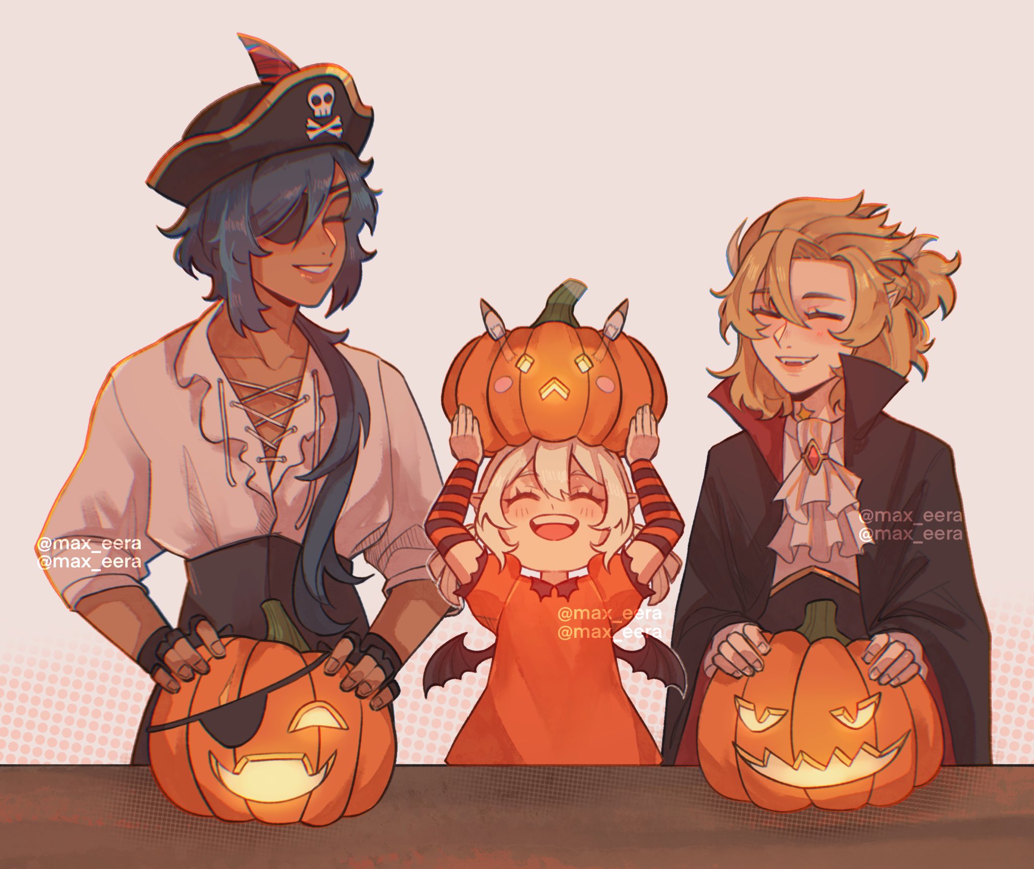 1girl 2boys albedo_(genshin_impact) alternate_costume arms_up artist_name ascot bat_wings black_cloak black_gloves black_hat black_pants blonde_hair blue_hair blush braid child cloak closed_eyes collarbone collared_shirt commentary dark-skinned_male dark_skin detached_sleeves dress english_commentary eyepatch fake_wings fang fangs fingerless_gloves fingernails food gem genshin_impact gloves hair_between_eyes half_up_braid halloween halloween_costume happy hat high-waist_pants highres holding holding_food holding_pumpkin holding_vegetable kaeya_(genshin_impact) klee_(genshin_impact) light_brown_hair lips long_hair long_sleeves low_twintails max_eera multiple_boys open_mouth orange_dress pants pirate_costume pirate_hat pointy_ears ponytail puffy_long_sleeves puffy_short_sleeves puffy_sleeves pumpkin red_cloak red_gem scar scar_on_neck shirt short_hair short_ponytail short_sleeves sidelocks simple_background skull_print smile standing striped_sleeves table teeth tongue twintails two-sided_cloak two-sided_fabric vampire_costume vegetable watermark white_ascot white_background white_shirt wide_sleeves wings