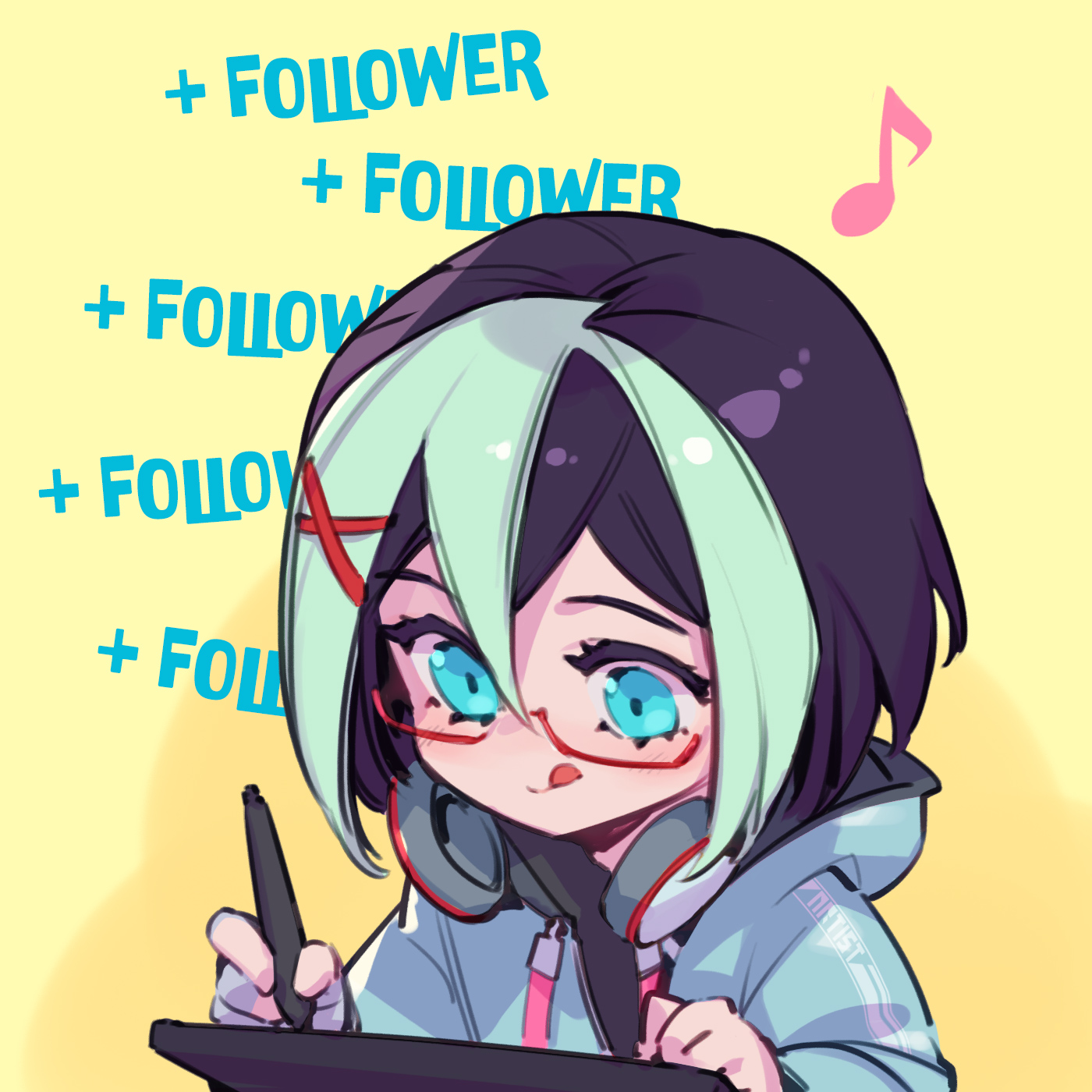 1girl :q artist_self-insert black_hair blonde_hair blush green_eyes headphones headphones_around_neck highres long_sleeves musical_note original phantom_cross red-framed_eyewear semi-rimless_eyewear short_hair solo tongue tongue_out upper_body