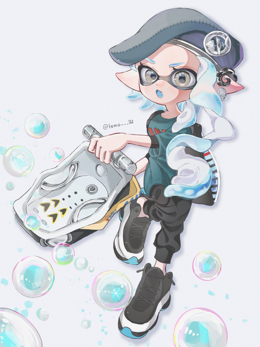 1girl beret black_pants black_shoes bloblobber_(splatoon) blue_hair commentary_request dot_nose earrings fang full_body green_shirt grey_eyes grey_hat hat highres ink_tank_(splatoon) inkling inkling_girl inkling_player_character jewelry lemo_(lemo_4) long_hair nintendo open_mouth pants pointy_ears shirt shoes simple_background skin_fang soap_bubbles solo splatoon_(series) splatoon_3 tentacle_hair v-shaped_eyebrows white_background