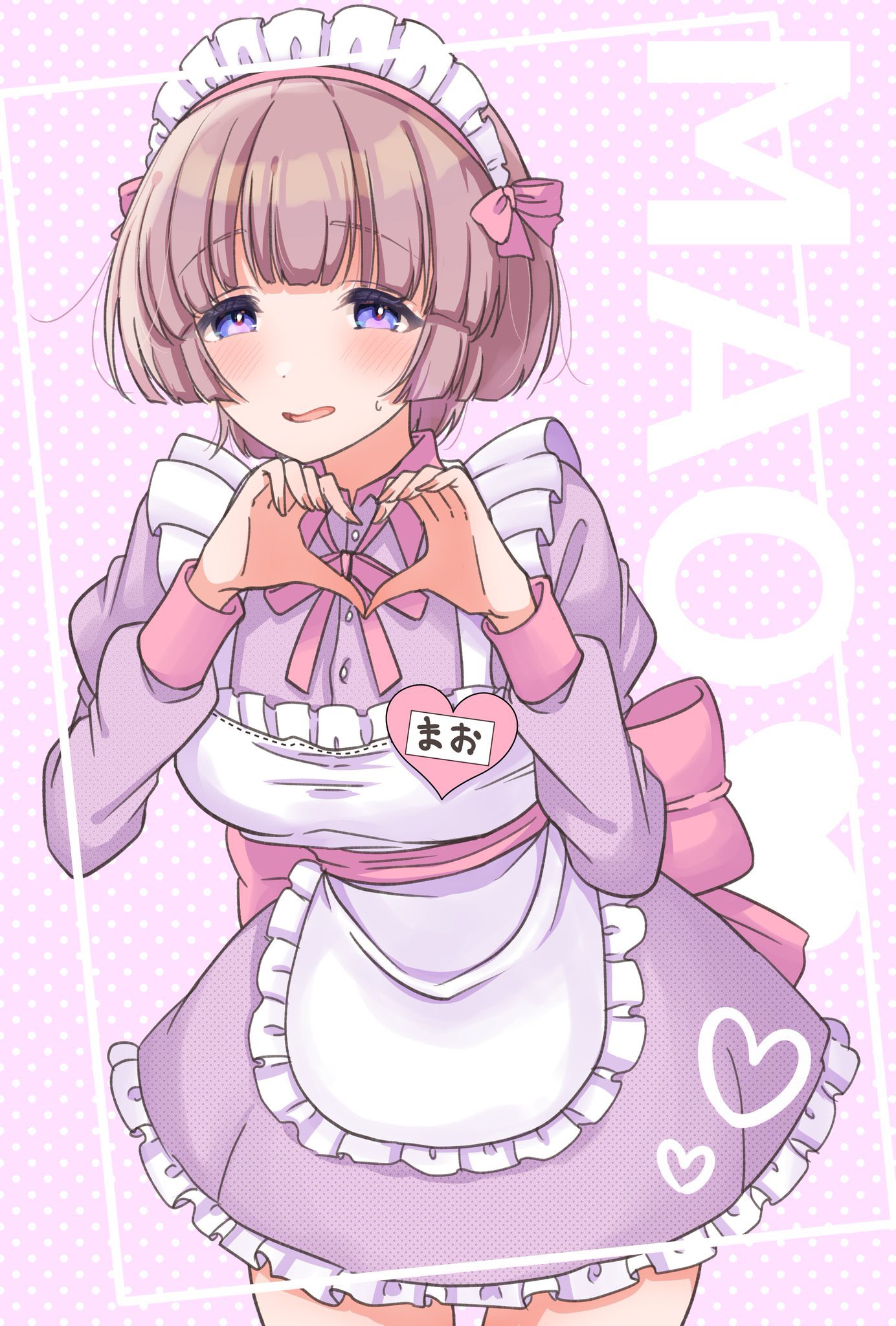 1girl apron arimura_mao commentary_request dress embarrassed frilled_dress frills gakuen_idolmaster grey_hair heart heart_hands highres idolmaster maid maid_headdress mariabowl purple_dress purple_eyes short_hair solo translated