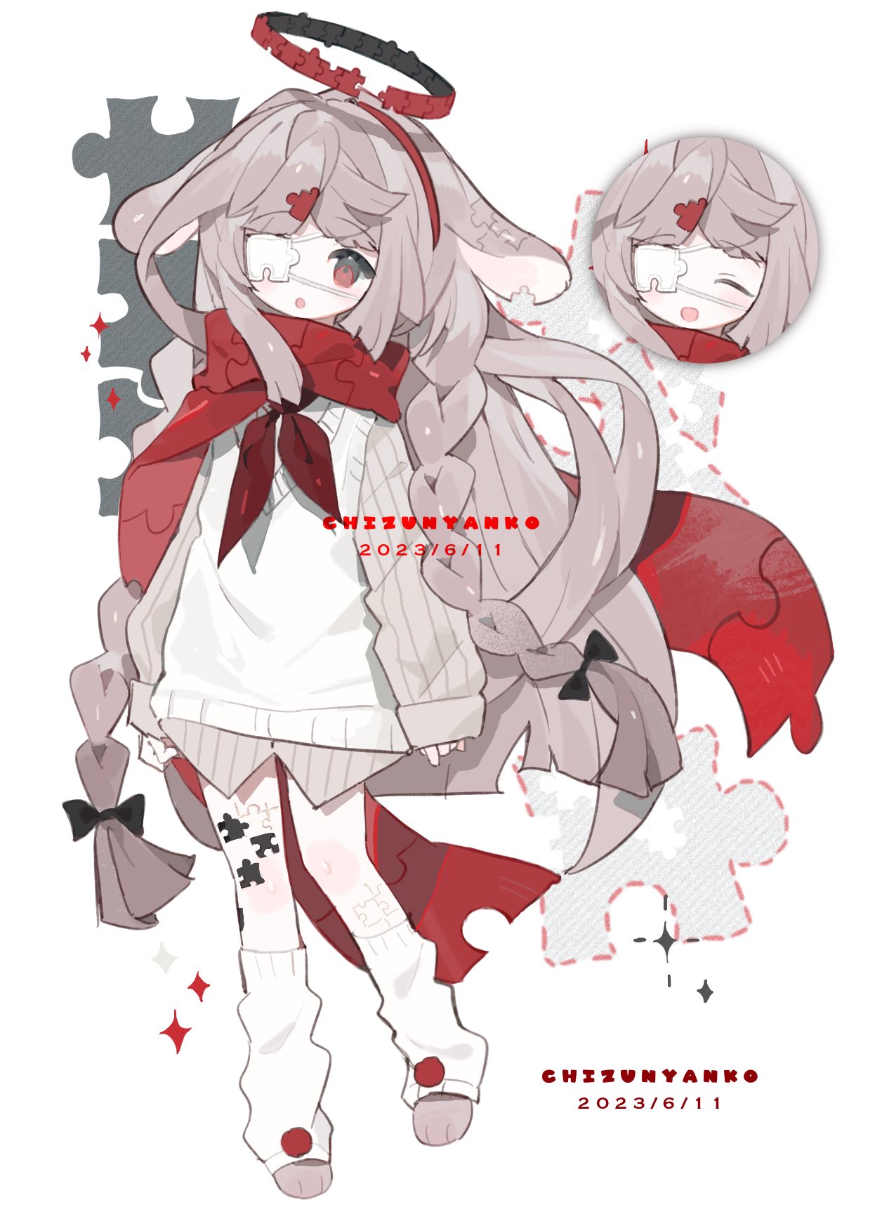 1girl animal_ears artist_name bandaid bandaid_on_leg black_bow blush bow braid brown_hair chizunyanko closed_eyes dated eyepatch full_body gauze hair_bow hair_ornament hairband halo heart highres leg_warmers long_hair long_sleeves looking_at_viewer medical_eyepatch multiple_views neckerchief open_mouth original rabbit_ears red_eyes red_neckerchief red_scarf scarf shirt signature sleeves_past_wrists smile socks sweater twin_braids very_long_hair white_background white_sweater