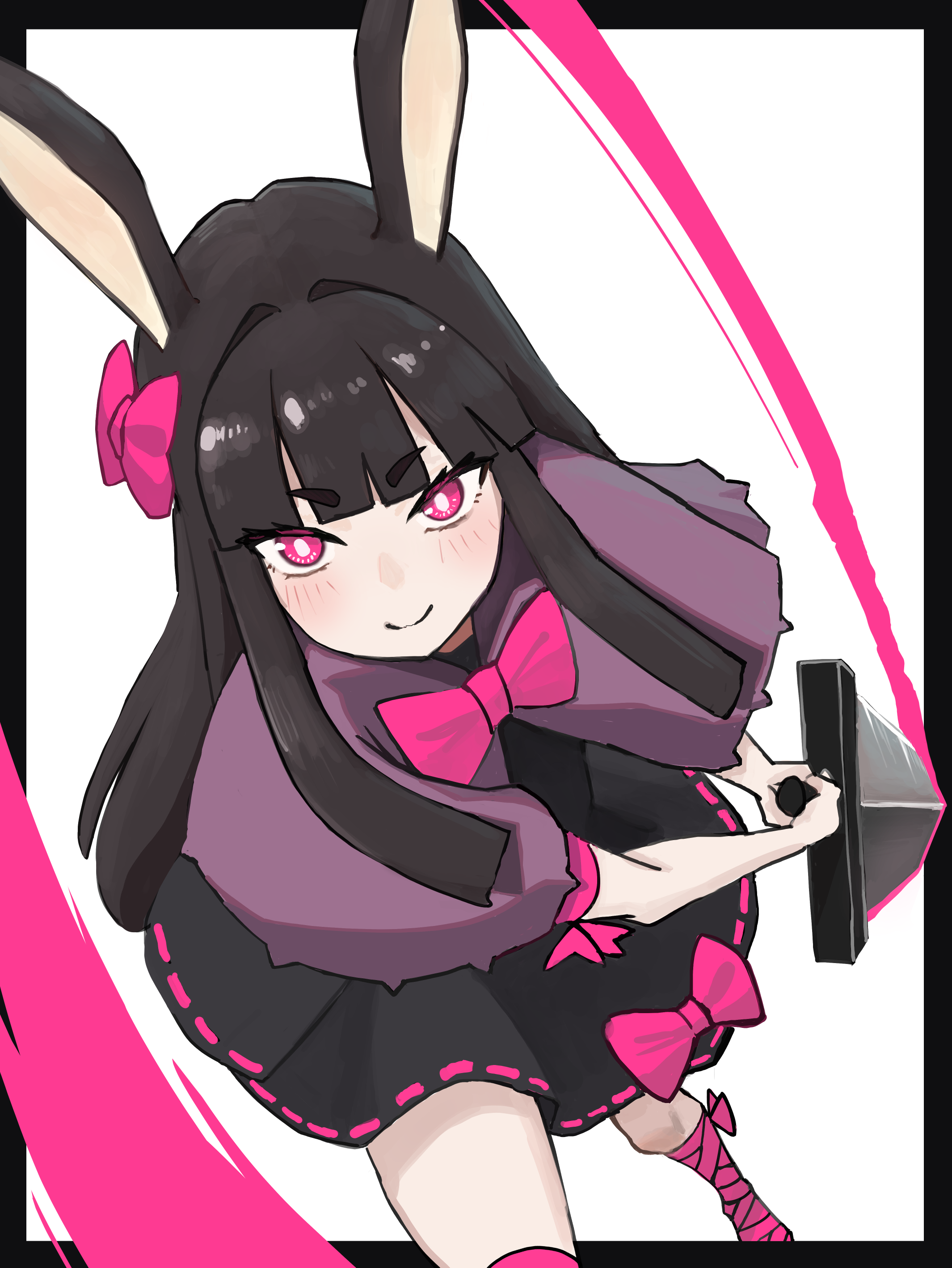 1girl absurdres animal_ears black_hair blunt_bangs blush bow bowtie capelet closed_mouth commentary_request dress foot_out_of_frame foot_wraps hair_bow hair_intakes heavyblade_rabbit highres hime_cut holding holding_sword holding_weapon long_hair looking_at_viewer onbashria pink_bow pink_bowtie purple_capelet rabbit_and_steel rabbit_ears rabbit_girl ribbon-trimmed_dress ribbon_trim simple_background smile solo sword weapon white_background