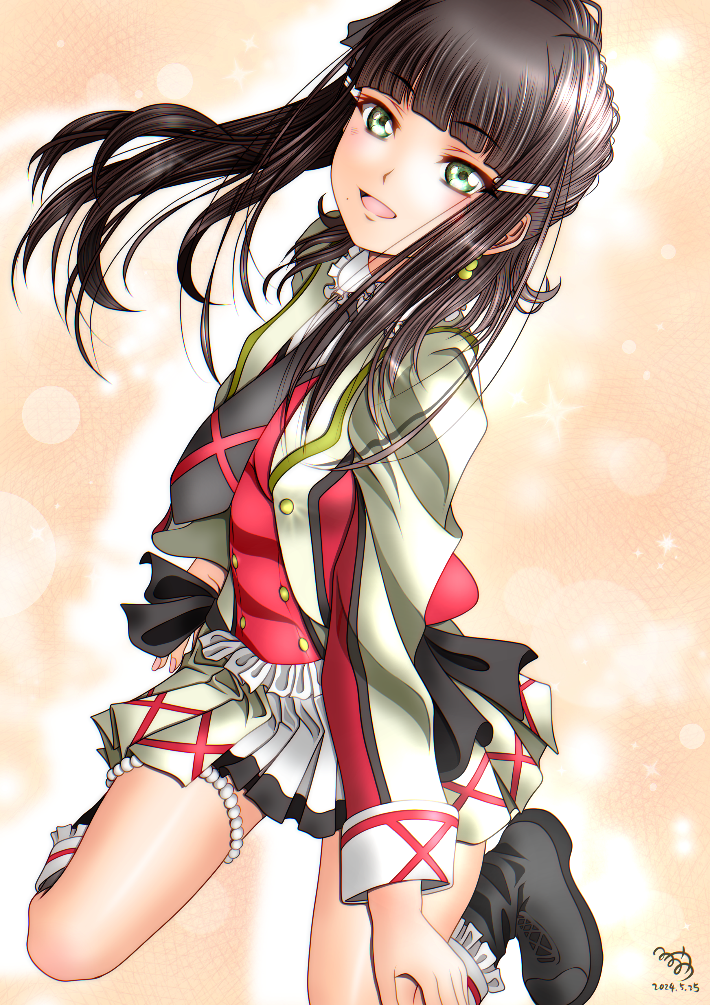 1girl absurdres aqua_eyes brown_hair highres kurosawa_dia long_hair long_sleeves love_live! love_live!_sunshine!! minami_saan mirai_ticket smile solo