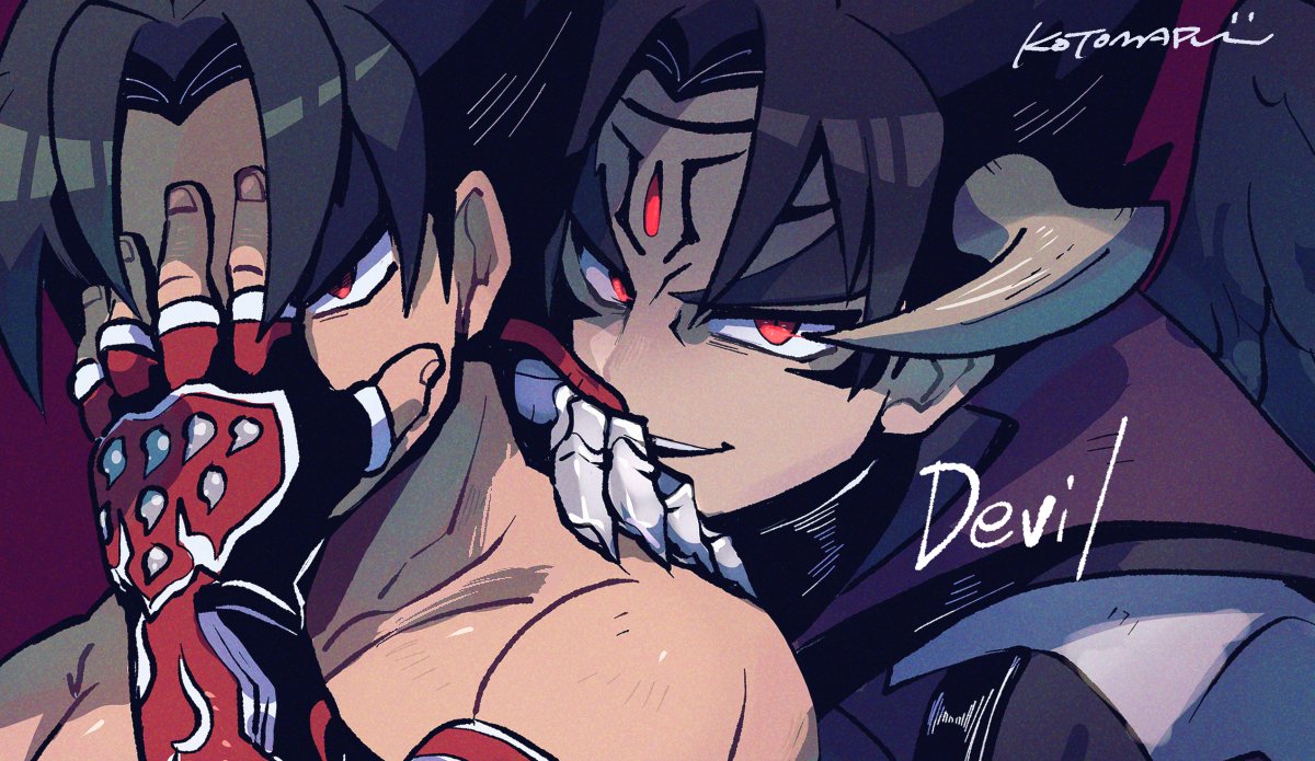 2boys black_hair black_wings character_name commentary covering_face devil_jin dual_persona fingerless_gloves forehead_jewel gloves grey_horns hand_on_another's_neck horns kazama_jin kotomaru_(kotokoto_kottan) looking_at_viewer male_focus multiple_boys parted_lips red_eyes red_gloves short_hair signature studded_gloves untranslatable_commentary tekken wings