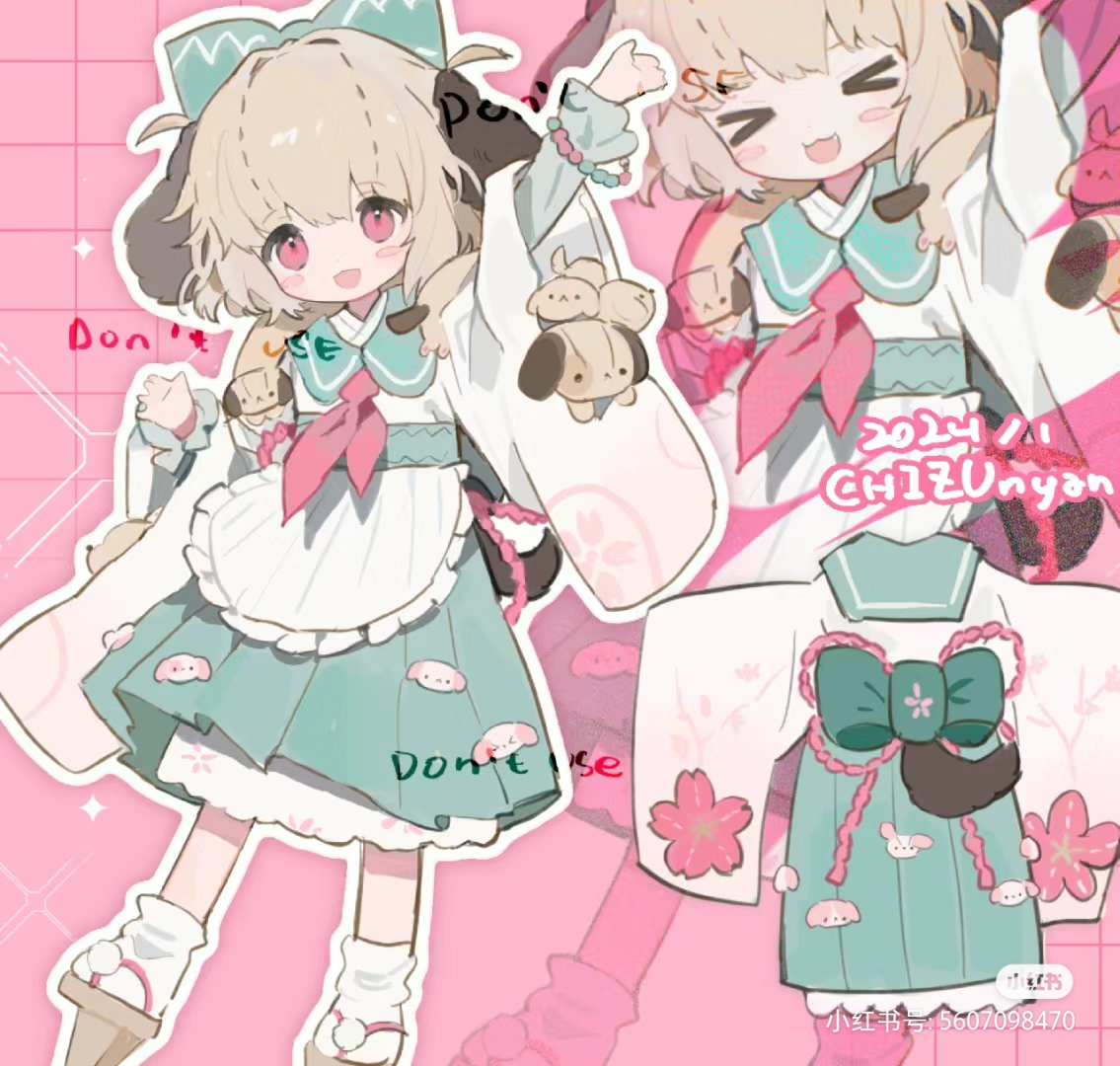 >_< 1girl 2024 :3 :d ^_^ animal_ears apron arm_up artist_name bad_source blush_stickers bow bracelet brown_footwear brown_hair character_name chizunyanko closed_eyes cropped_torso dated dog_ears dress frilled_apron frills geta green_bow green_skirt grid_background hand_up japanese_clothes jewelry kimono layered_dress layered_sleeves long_sleeves looking_at_viewer multiple_views neckerchief open_mouth original pink_background pink_eyes pink_neckerchief pleated_skirt sailor_collar signature skirt smile socks tabi tongue watermark white_dress white_socks wide_sleeves x3 xiaohongshu_watermark