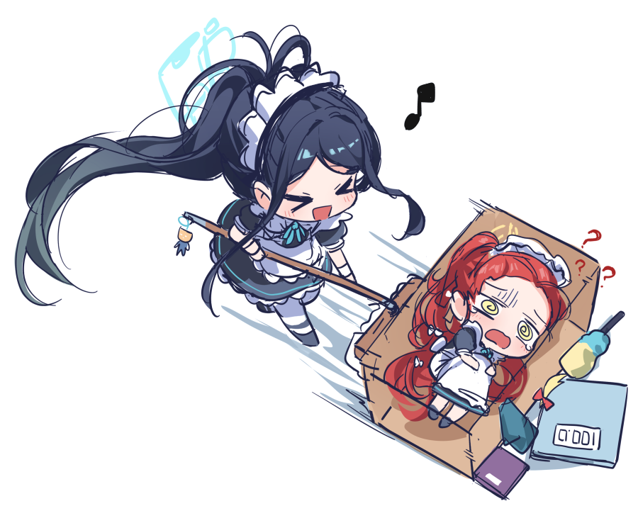 >_< kei_(robot)_(blue_archive) 2girls ? @_@ absurdly_long_hair apron aris_(blue_archive) aris_(maid)_(blue_archive) black_dress black_footwear black_hair blue_archive blue_halo blush dress duster eighth_note frilled_apron frills gyool halo long_hair maid maid_apron maid_headdress multiple_girls musical_note official_alternate_costume open_mouth pantyhose ponytail red_hair shoes short_sleeves simple_background smile very_long_hair white_apron white_background white_pantyhose yellow_halo yuzu_(blue_archive) yuzu_(maid)_(blue_archive)