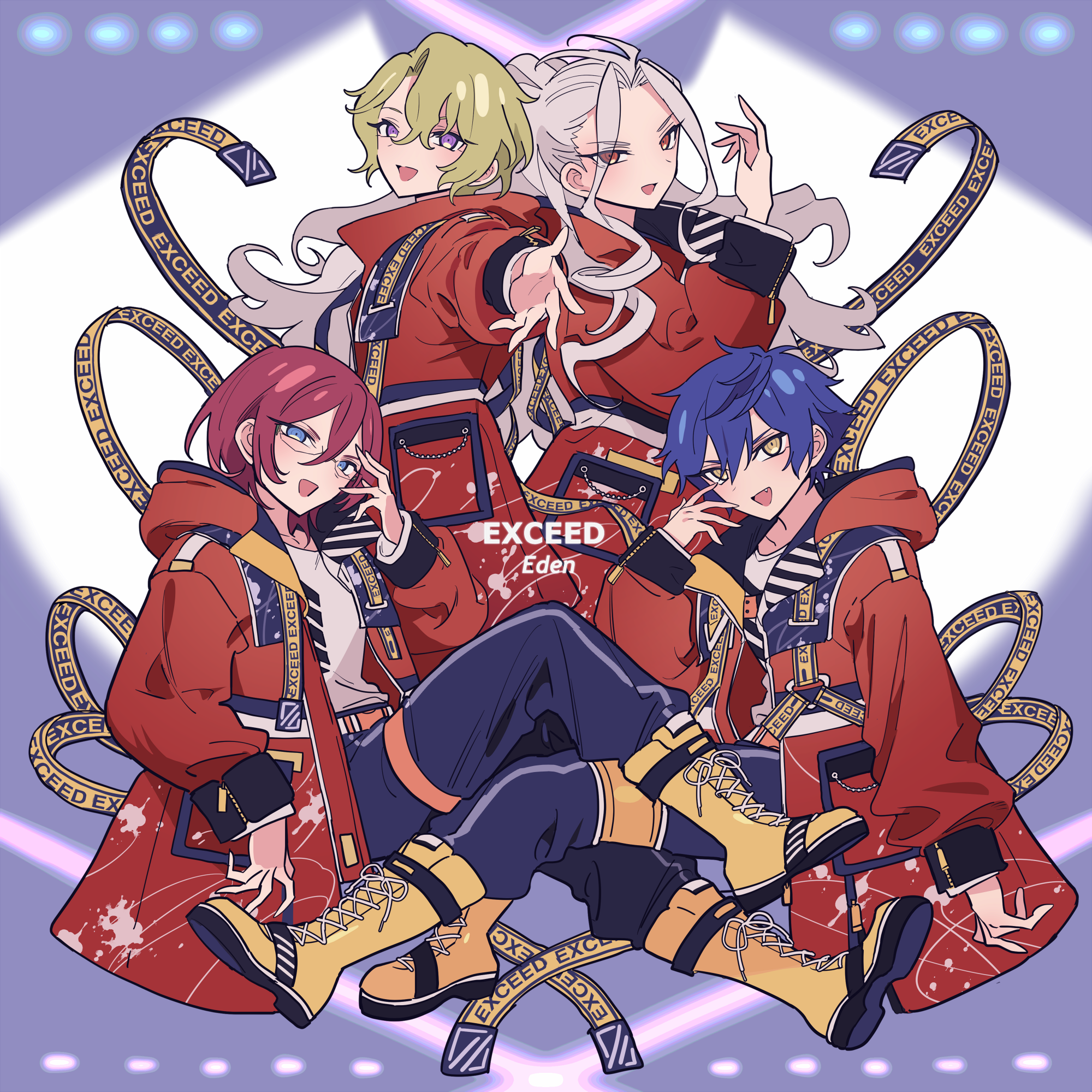 4boys bad_id bad_pixiv_id blue_eyes blue_hair blue_pants boots eden_(ensemble_stars!) ensemble_stars! full_body glasses green_hair grey_hair group_name hair_between_eyes hand_up highres idol_clothes jacket knee_boots long_hair long_sleeves looking_at_viewer male_focus meremero multiple_boys open_mouth pants ponytail purple_eyes ran_nagisa reaching reaching_towards_viewer red_eyes red_jacket saegusa_ibara sazanami_jun shirt short_hair sitting smile standing tomoe_hiyori white_shirt yellow_boots yellow_eyes