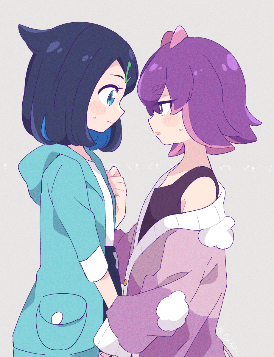 0zr8hc 2girls black_hair black_shirt blue_eyes blue_hair blue_jacket colored_inner_hair dot_(pokemon) from_side hair_ornament hairclip highres jacket liko_(pokemon) looking_at_another multicolored_hair multiple_girls nintendo off_shoulder open_clothes open_jacket pink_hair pink_jacket pokemon pokemon_(anime) pokemon_horizons purple_eyes purple_hair shirt two-tone_hair white_shirt yuri