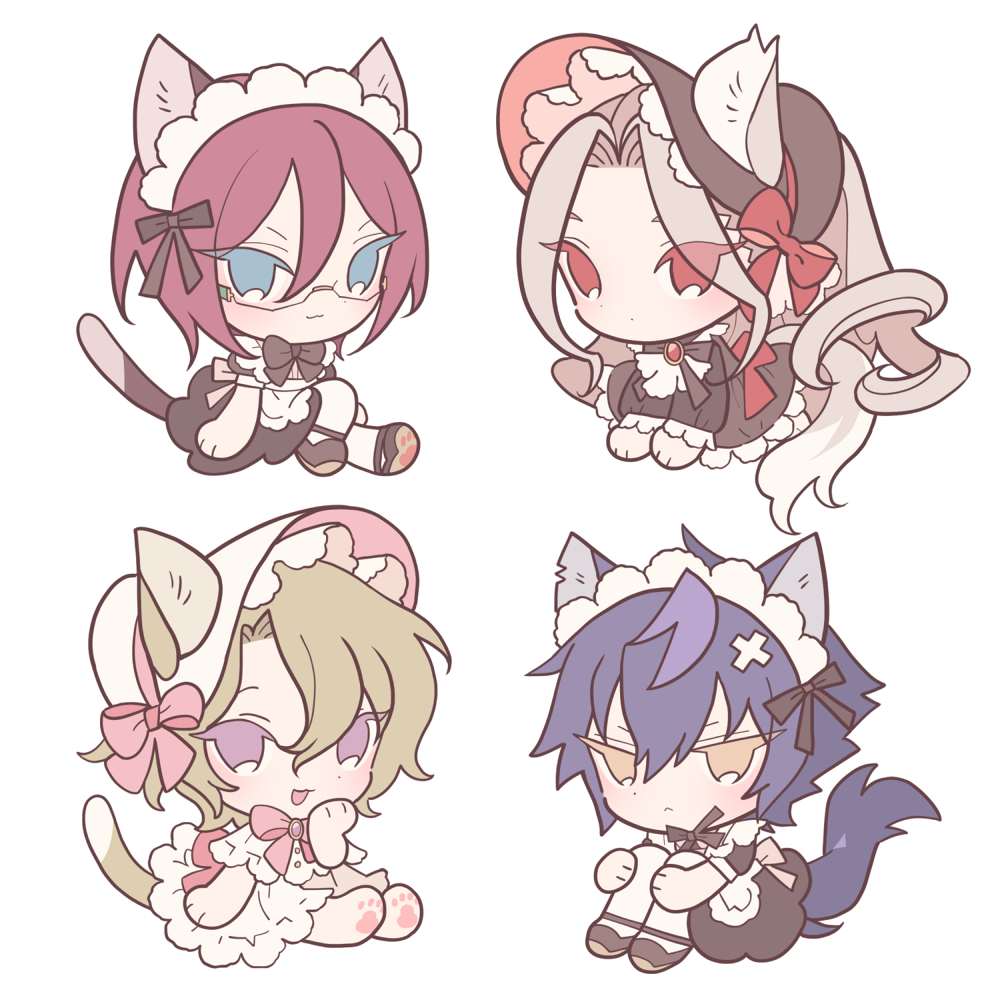 4boys animal_ears bad_id bad_pixiv_id black_dress black_ribbon blue_eyes blue_hair bonnet cat_boy cat_ears cat_tail chibi chibi_only closed_mouth crossdressing crossdressing_(mtf) dress ensemble_stars! frilled_dress frills full_body glasses green_hair hair_between_eyes hair_ribbon hand_up lolita_fashion long_hair long_sleeves looking_at_viewer maid maid_headdress male_focus male_maid meremero multiple_boys open_mouth purple_eyes purple_hair ran_nagisa ribbon saegusa_ibara sazanami_jun short_hair simple_background sitting smile tail tomoe_hiyori white_background white_dress yellow_eyes