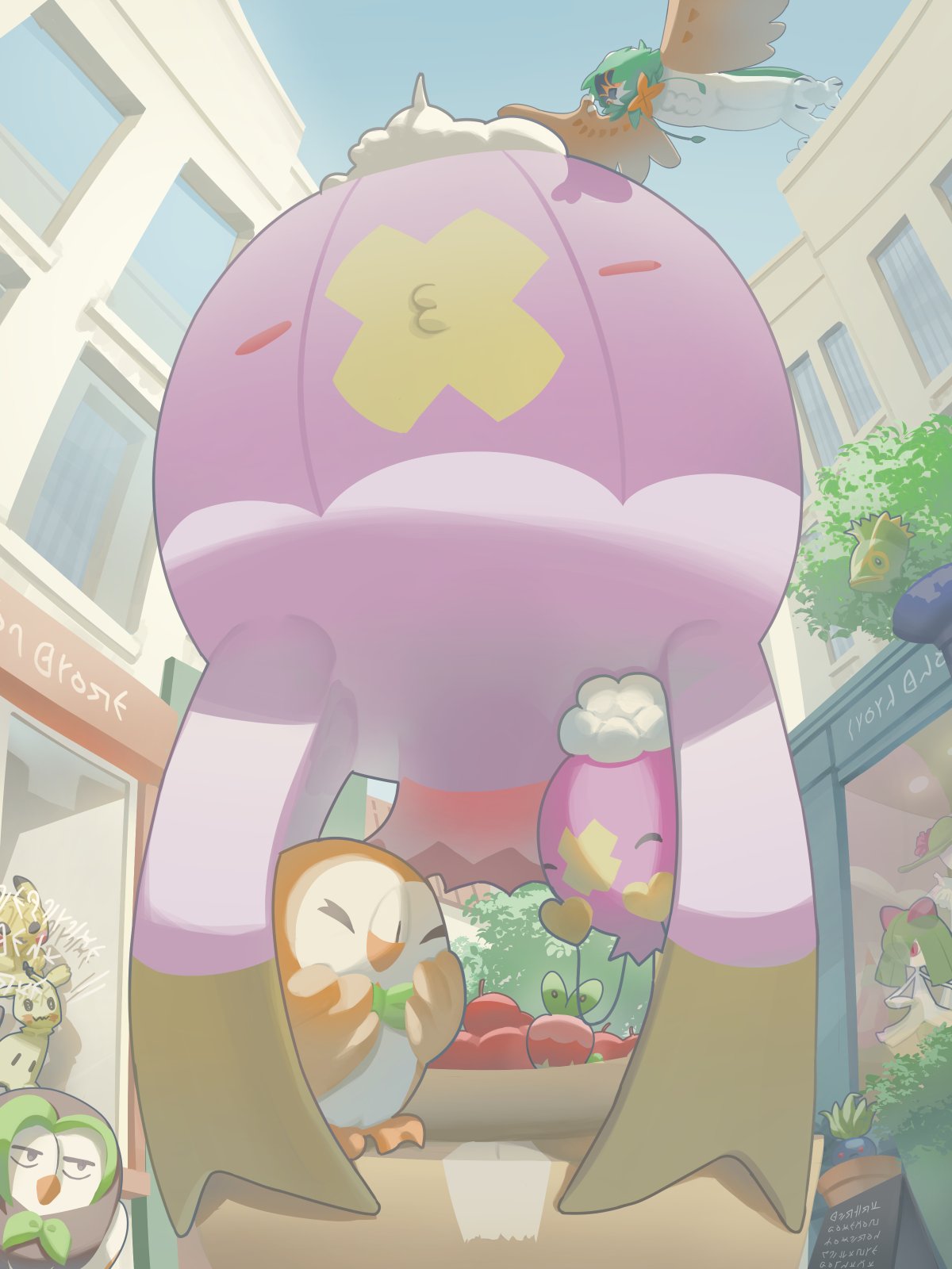 applin basket building closed_eyes commentary_request dartrix day decidueye drifblim drifloon gen_3_pokemon gen_4_pokemon gen_7_pokemon gen_8_pokemon hiding highres kirlia mimikyu mokukitusui nintendo no_humans o3o outdoors pokemon pokemon_(creature) rowlet sky window