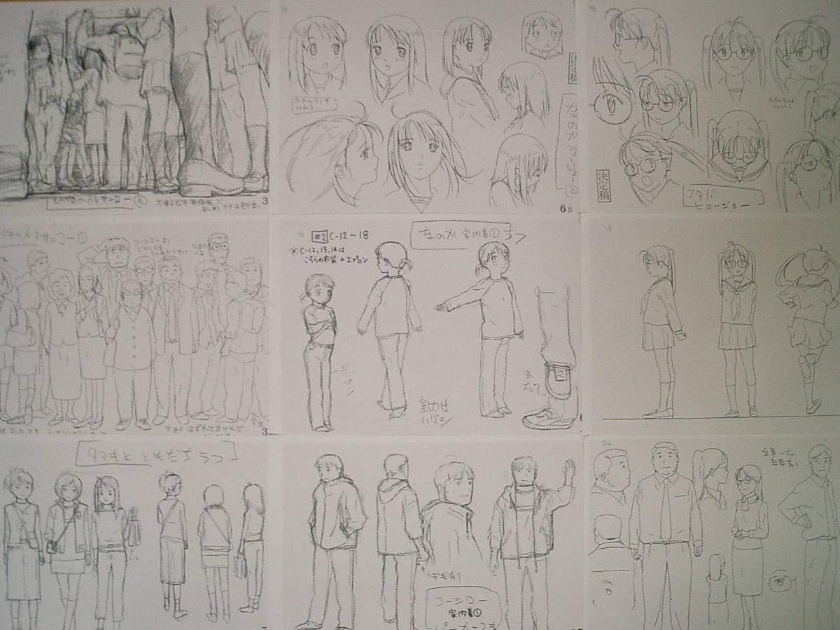 2000s_(style) 6+boys 6+girls age_difference character_request reference_sheet glasses jacket kohinata_nanoka koi_kaze multiple_boys multiple_girls official_art pants production_art saeki_koshiro shoes short_twintails sneakers traditional_media twintails