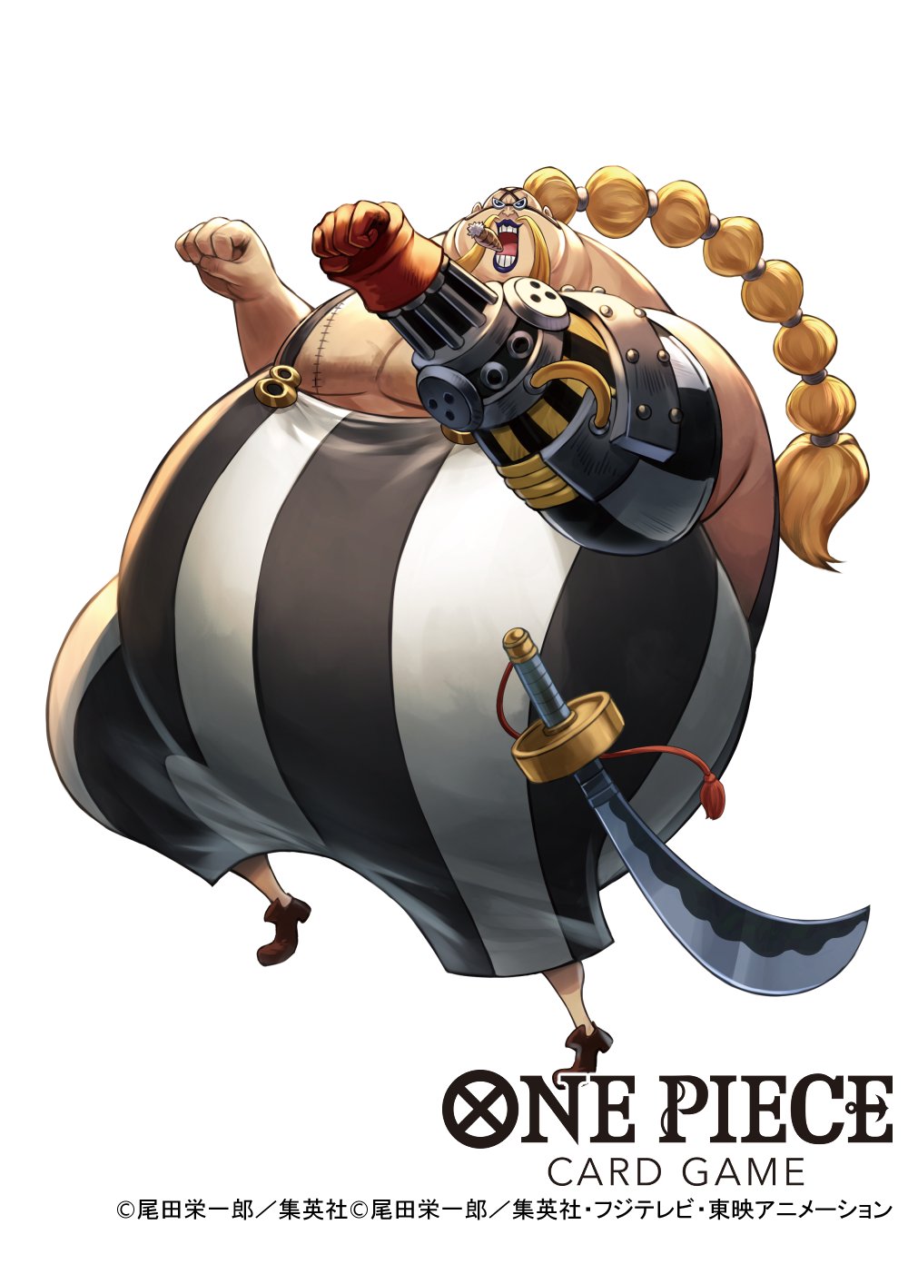1boy black_lips blonde_hair cigar commentary_request copyright_name facial_hair full_body highres long_mustache looking_at_viewer male_focus mechanical_arms mustache official_art one_piece one_piece_card_game overalls ponytail queen_(one_piece) rokushiro_koushi simple_background single_mechanical_arm solo stitched_torso stitches sunglasses sword vertical-striped_overalls weapon white_background