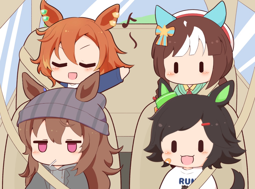 4girls animal_ears bandaid bandaid_on_cheek bandaid_on_face beanie beret black_hair blue_jacket blush_stickers brown_hair car_interior chibi closed_eyes clothes_writing collared_shirt commentary_request drawstring ears_through_headwear eighth_note gomashio_(goma_feet) grey_hat grey_hoodie grey_jacket hair_between_eyes hair_ornament hairclip hat hokko_tarumae_(umamusume) hood hood_down hoodie horse_ears horse_girl horse_print horse_tail jacket jitome long_sleeves multicolored_hair multiple_girls musical_note nakayama_festa_(umamusume) open_clothes open_jacket orange_hair outstretched_arm parted_bangs photo-referenced print_shirt purple_eyes seatbelt shirt sitting sleeves_past_wrists swept_bangs t.m._opera_o_(umamusume) tail two-tone_hair umamusume v-shaped_eyebrows vehicle_interior white_hair white_hat white_shirt winning_ticket_(umamusume) yellow_shirt