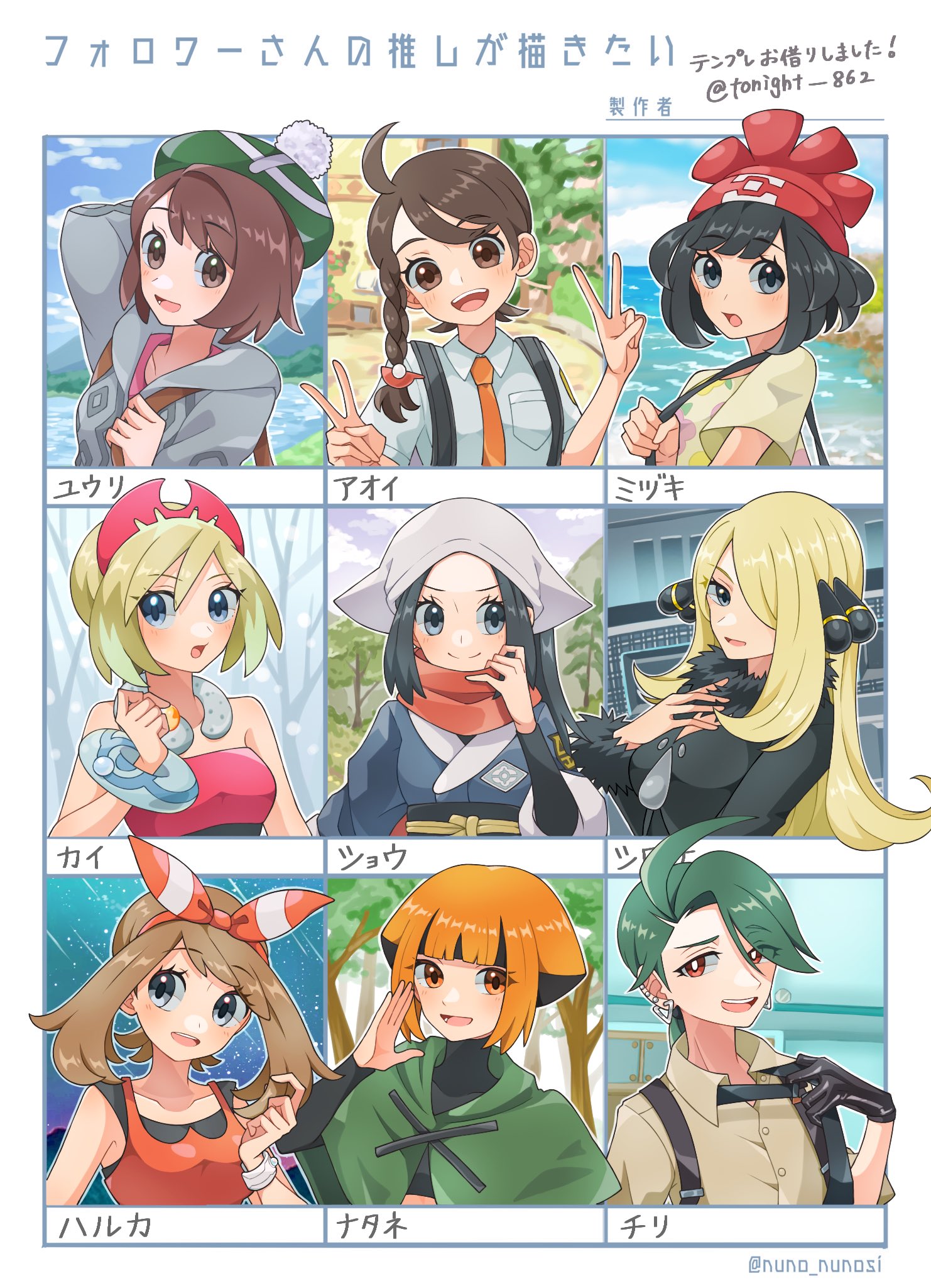 6+girls :d :o akari_(pokemon) bare_shoulders black_coat black_eyes black_gloves black_hair black_necktie blonde_hair bow braid brown_eyes brown_hair brown_shirt closed_mouth coat collarbone collared_shirt commentary_request cynthia_(pokemon) double_v dress earrings followers_favorite_challenge gardenia_(pokemon) gloria_(pokemon) gloves green_hair grey_eyes hair_bow hair_ornament hair_over_one_eye hairband hat highres irida_(pokemon) japanese_clothes jewelry juliana_(pokemon) long_hair looking_at_viewer may_(pokemon) multicolored_hair multiple_drawing_challenge multiple_girls naranja_academy_school_uniform necktie nintendo open_mouth orange_eyes orange_hair orange_necktie pokemon pokemon_diamond/pearl/platinum pokemon_legends:_arceus pokemon_omega_ruby_and_alpha_sapphire pokemon_sun_and_moon pokemon_scarlet_and_violet pokemon_sword_and_shield poncho rain_(tonight_862) red_bow red_dress red_eyes red_hairband red_hat red_scarf rika_(pokemon) scarf school_uniform selene_(pokemon) shirt short_hair single_braid sleeveless sleeveless_dress sleeveless_shirt smile twitter_username two-tone_hair upper_body v white_shirt yellow_shirt