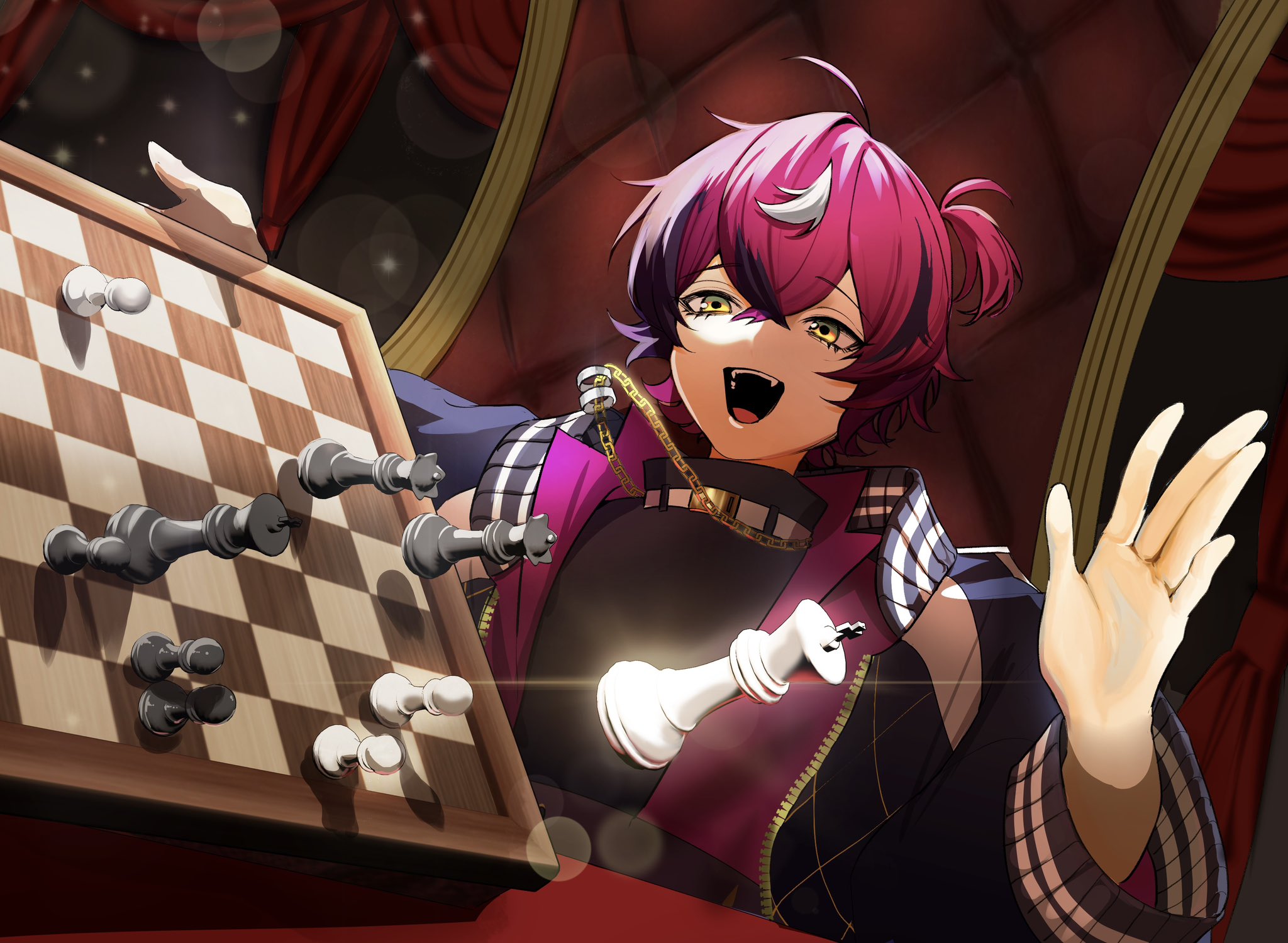 1boy black_hair board_game chain chain_necklace chair chess chess_piece chessboard crossed_bangs curtains doppio_dropscythe doppio_dropscythe_(1st_costume) gold_necklace highres jewelry long_sleeves male_focus multicolored_hair murasaki500 necklace nijisanji nijisanji_en open_mouth purple_hair ring ring_necklace short_hair short_side_ponytail side_ponytail smile streaked_hair teeth upper_teeth_only virtual_youtuber white_hair yellow_eyes