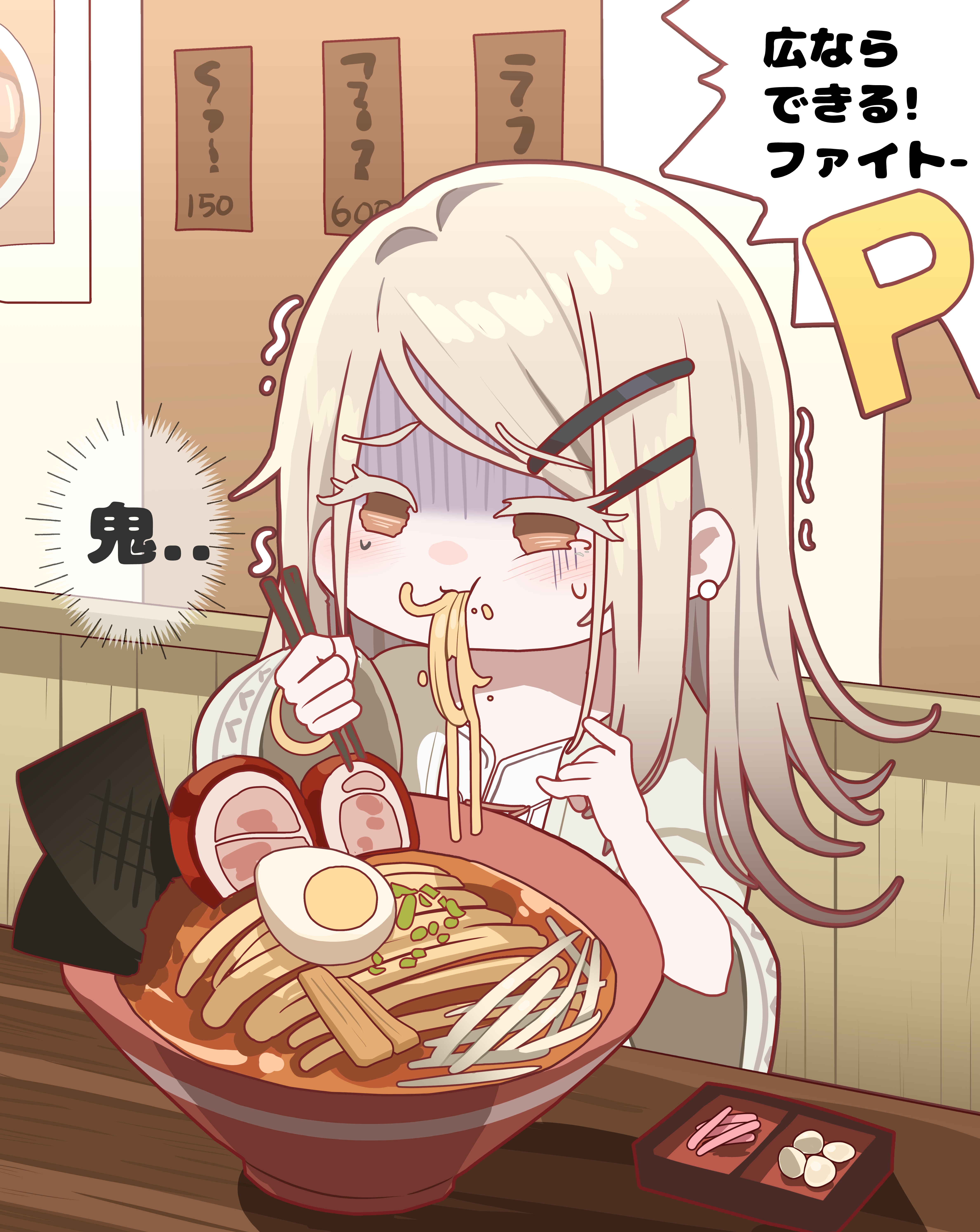 1girl absurdres camisole chopsticks colored_eyelashes commentary_request eating egg_(food) food gakuen_idolmaster gradient_hair grey_hair highres holding holding_chopsticks idolmaster light_brown_hair long_hair looking_ahead multicolored_hair noodles p-head_producer producer_(idolmaster) ramen restaurant robe shinosawa_hiro solo sweatdrop sylph_kim tears translation_request trembling turn_pale white_camisole white_robe