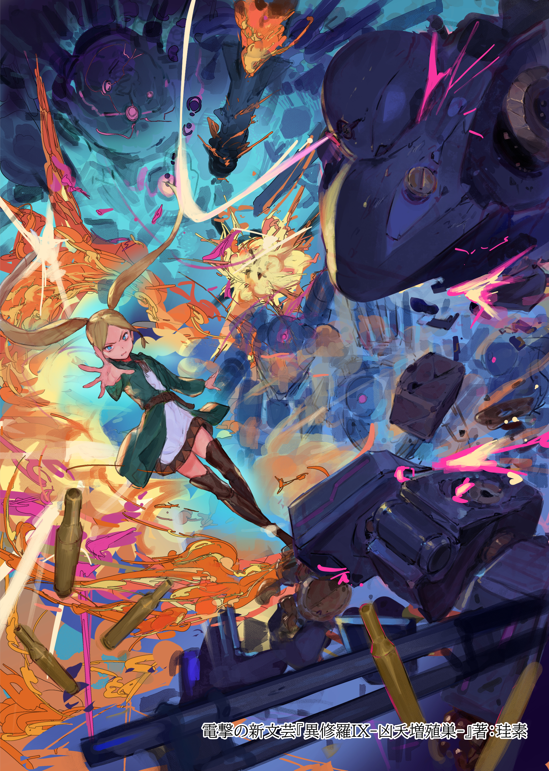 1girl absurdres belt blonde_hair blue_eyes brown_belt brown_footwear cloak cover cover_page dress explosion fire glowing glowing_eye golem green_cloak highres ishura kia_the_world_word kureta_(nikogori) mestelexil_the_box_of_desperate_knowledge novel_cover official_art purple_eyes robot rocket shell_casing twintails white_dress