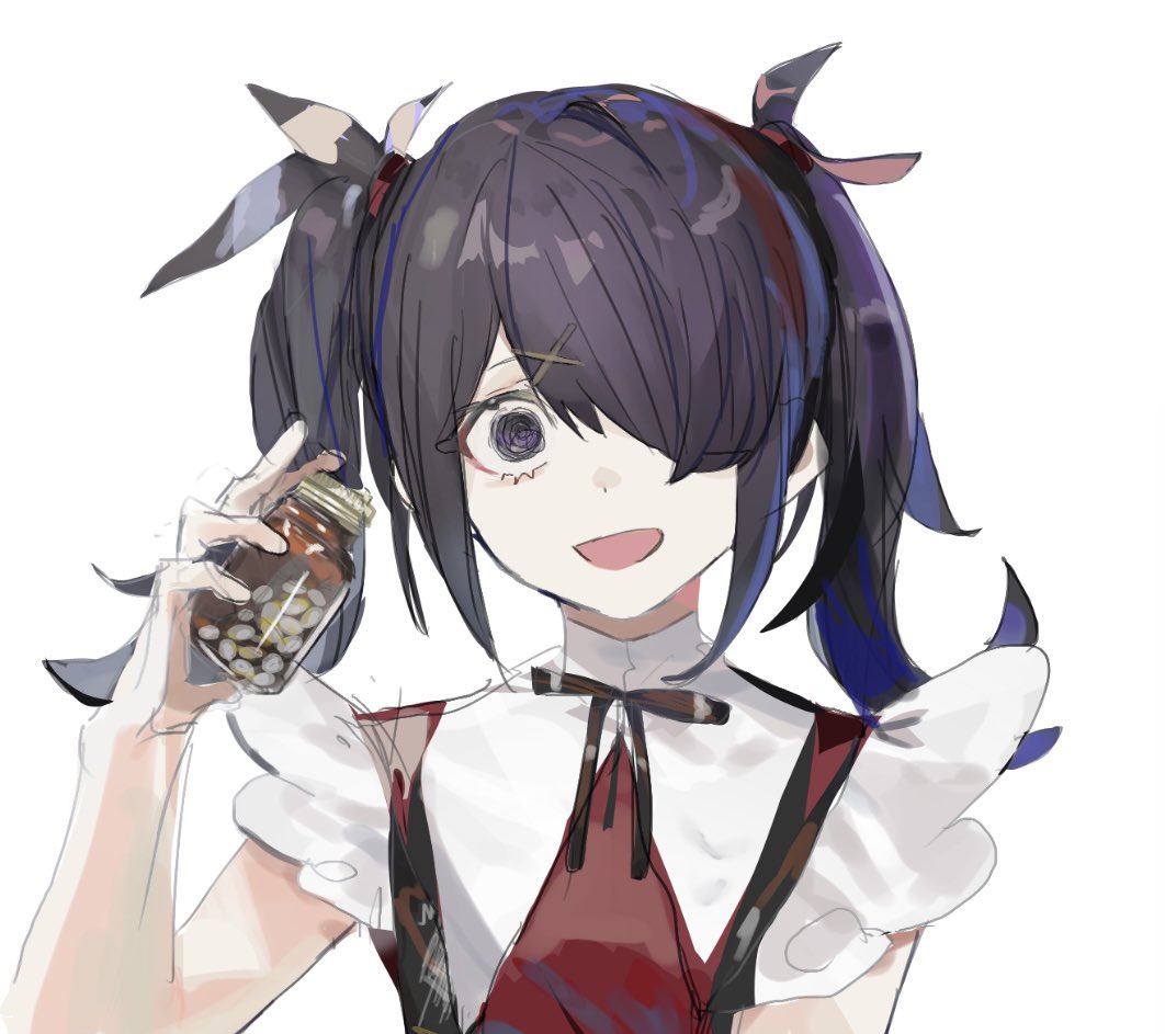 1girl :d @_@ ame-chan_(needy_girl_overdose) black_eyes black_hair black_ribbon bottle collared_shirt commentary_request crazy_eyes hair_ornament hair_over_one_eye hand_up holding holding_bottle long_hair looking_at_viewer neck_ribbon needy_girl_overdose open_mouth pill pill_bottle red_shirt ribbon shirt simple_background smile solo suspenders tsukikaze_aki twintails upper_body white_background x_hair_ornament