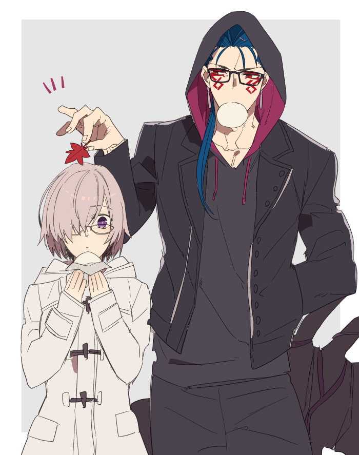 1girl autumn_leaves bad_id bad_pixiv_id blue_hair coat cu_chulainn_(fate) cu_chulainn_alter_(fate) cu_chulainn_alter_(lawson)_(fate) dragon_tail earrings facepaint fate/grand_order fate_(series) glasses hair_over_one_eye hand_in_pocket hood hoodie ichimatsuinfo jewelry leaf long_hair mash_kyrielight mash_kyrielight_(lawson_2017) purple_eyes purple_hair short_hair tail winter_clothes winter_coat