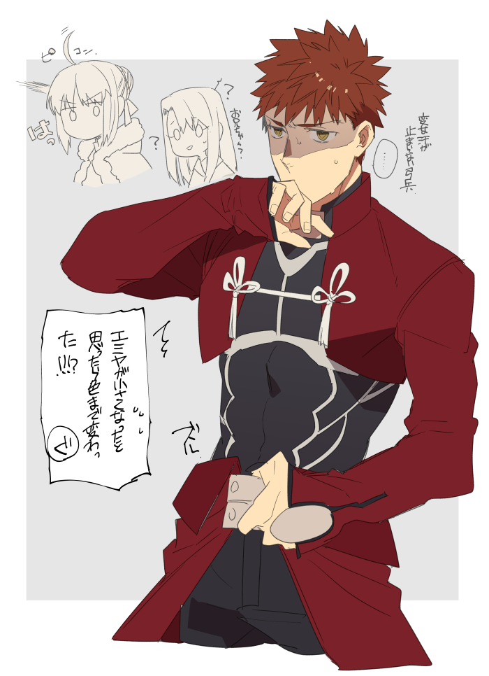 ... 1boy ahoge archer_(fate) armor artoria_pendragon_(fate) bad_id bad_pixiv_id border cape chinese_knot emiya_shirou fate/stay_night fate_(series) ichimatsuinfo illyasviel_von_einzbern male_focus red_cape red_hair red_sleeves shaded_face sweatdrop translation_request