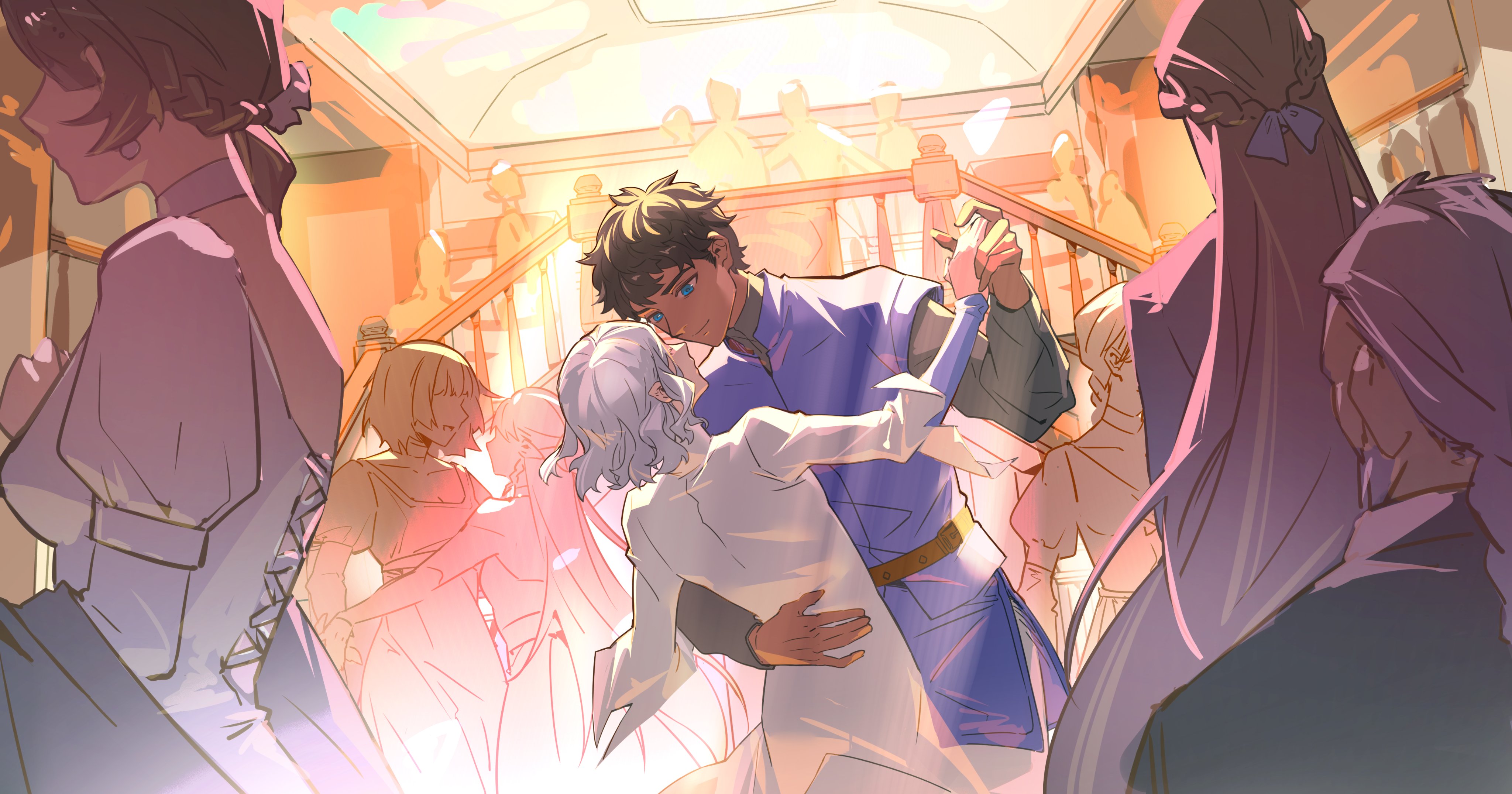 2boys absurdres beishang_yutou belt black_hair blue_eyes braid crowd curly_hair dancing dark-skinned_male dark_skin dress dungeon_meshi elf formal_clothes grey_hair hand_on_another's_back high_collar highres holding_hands indoors kabru long_hair looking_at_another male_focus mithrun multiple_boys notched_ear pointy_ears short_hair stairs waltz_(dance) yaoi