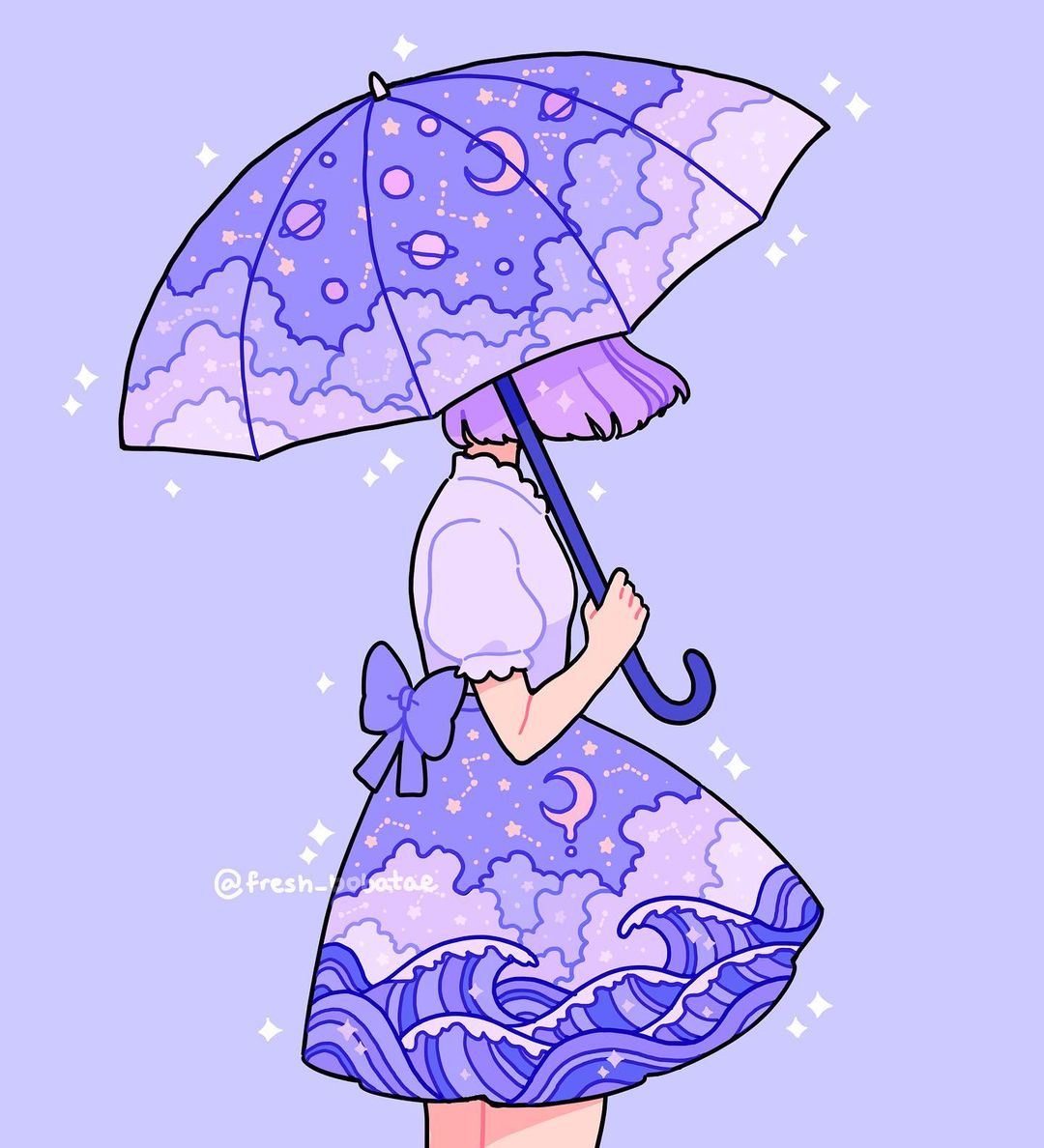 1girl back_bow blunt_ends bow cloud_print collared_shirt commentary constellation_print cowboy_shot crescent_print emily_kim english_commentary frilled_shirt_collar frilled_sleeves frills holding holding_umbrella instagram_username looking_afar miniskirt original planet planetary_ring puffy_short_sleeves puffy_sleeves purple_background purple_bow purple_hair purple_shirt purple_skirt purple_theme purple_umbrella shirt short_hair short_sleeves simple_background skirt solo space_print sparkle starry_sky_print umbrella wave_print