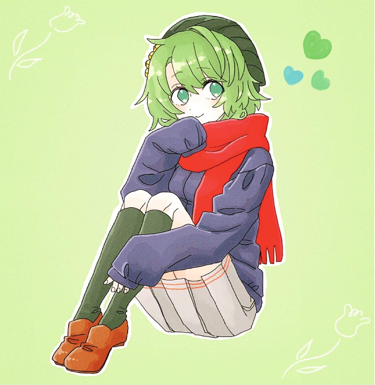 1girl beanie cosplay green_background green_eyes green_hair hat heart highres hiyori_sou hiyori_sou_(cosplay) kimi_ga_shine kizuchi_kanna long_sleeves looking_to_the_side pleated_skirt scarf sitting skirt sleeves_past_wrists smile socks solo yume_ha_imamo
