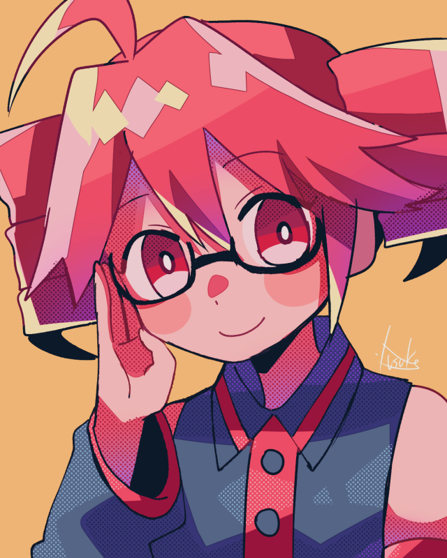 1girl ahoge bespectacled blush_stickers collared_shirt drill_hair glasses hand_up kasane_teto kasane_teto_(utau) long_sleeves looking_at_viewer orange_background pink_hair red_eyes shirt sleeveless sleeveless_shirt smile solo twin_drills utau yuusuke-kun