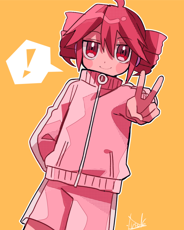 ! 1girl ahoge blush_stickers drill_hair high_collar jacket kasane_teto long_sleeves looking_at_viewer pink_hair red_eyes shorts smile solo spoken_exclamation_mark track_jacket track_suit twin_drills utau v yellow_background yuusuke-kun