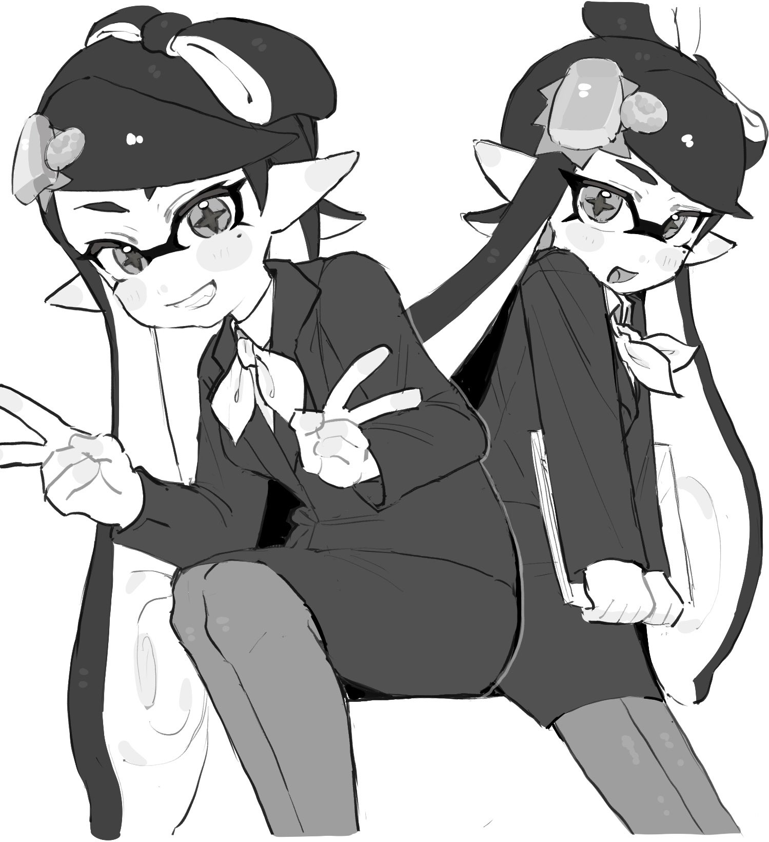 1girl black_hair black_suit bow-shaped_hair callie_(news_anchor)_(splatoon) callie_(splatoon) formal_clothes greyscale highres inkling long_hair mole mole_under_eye monochrome mt38lg nintendo object_on_head open_mouth pantyhose splatoon_(series) splatoon_1 splatoon_2 splatoon_3 star-shaped_pupils star_(symbol) suit symbol-shaped_pupils tentacle_hair