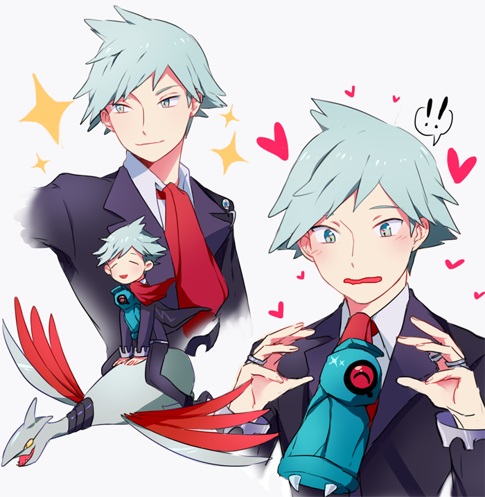 ! !! 1boy beldum blue_eyes blue_hair commentary english_commentary gen_2_pokemon gen_3_pokemon heart hyoon_(sockgyu) light_blue_hair male_focus mega_stone multiple_views nintendo one-eyed pokemon pokemon_(creature) pokemon_omega_ruby_and_alpha_sapphire riding riding_pokemon skarmory sparkle steven_stone white_background wings