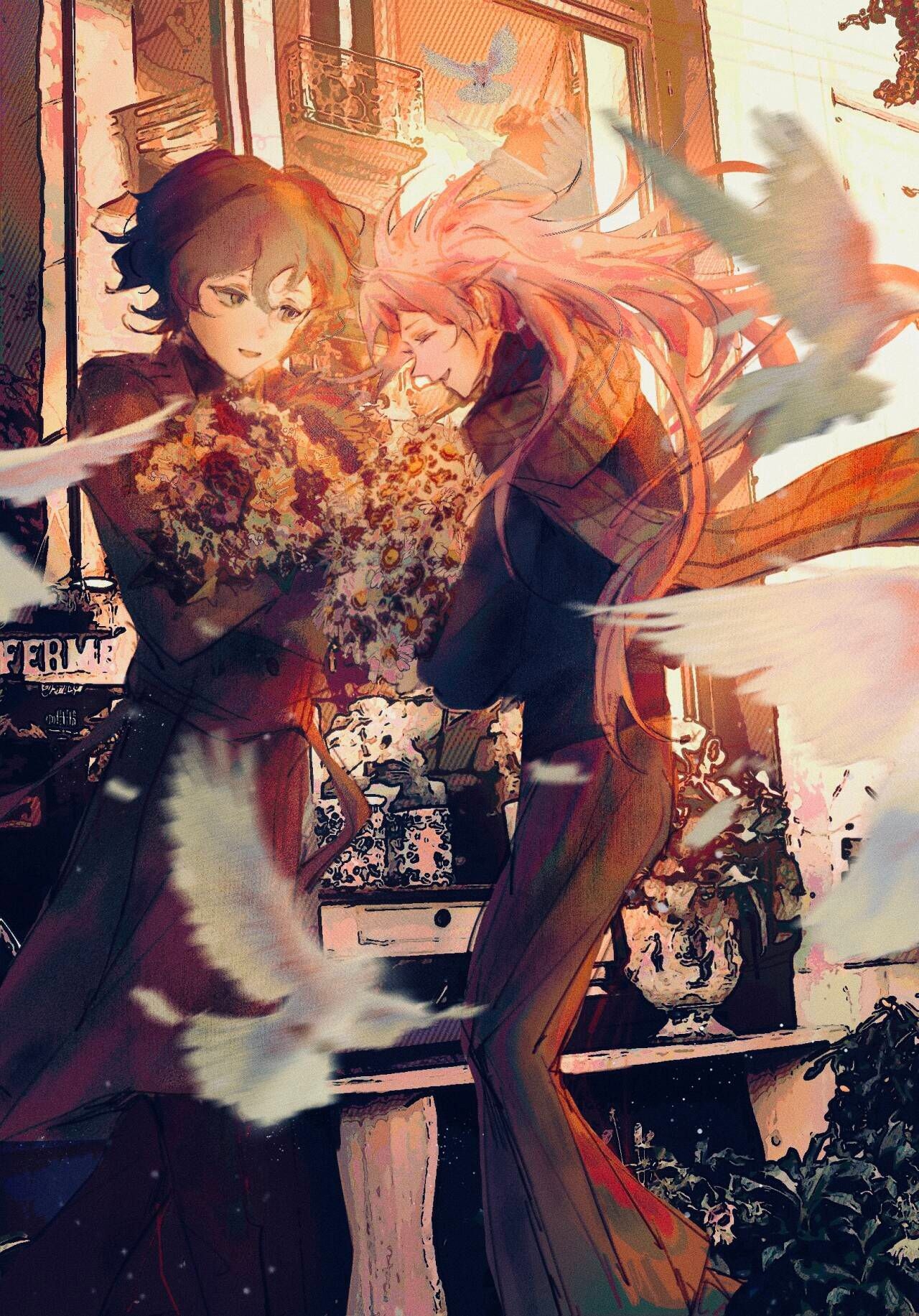 2boys bird black_pants black_sweater brown_coat brown_pants brown_scarf chinese_commentary closed_eyes coat commentary_request dove film_grain grey_eyes grey_hair hatsutori_hajime highres long_hair long_sleeves male_focus multiple_boys open_mouth pants pink_hair plaid_clothes plaid_scarf saibou_shinkyoku scarf short_hair simian_qiao_gu smile sweater utsugi_noriyuki