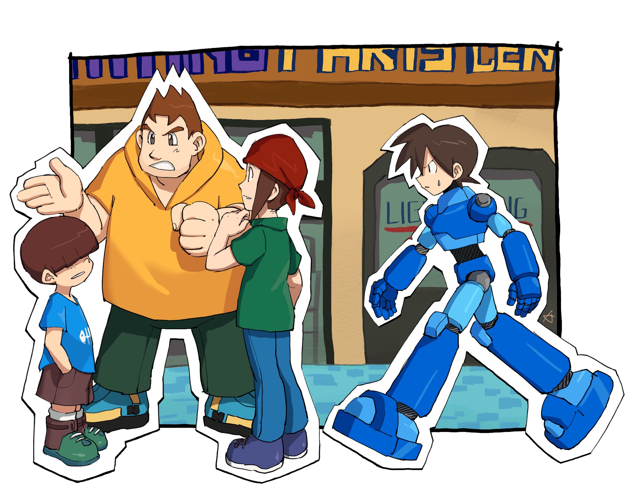 4boys armor bandana blue_armor blue_pants blue_shirt brown_hair brown_shorts character_request green_pants green_shirt hair_over_eyes highres hood hoodie karen_(karenoni1031) male_focus mega_man_(series) mega_man_legends_(series) mega_man_volnutt multiple_boys pants red_bandana shirt short_hair shorts talking walking yellow_hoodie