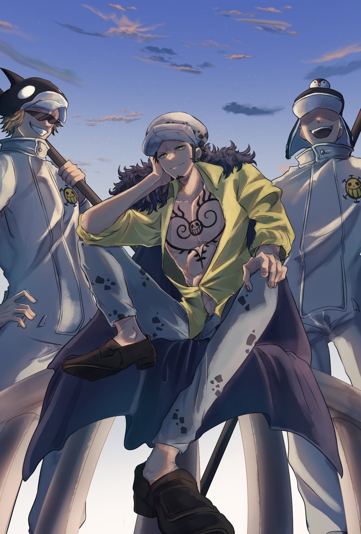 3boys chest_tattoo coat coat_on_shoulders commentary_request denim earrings facial_hair fur-trimmed_coat fur_trim goatee hat highres jeans jewelry jumpsuit looking_at_viewer male_focus multiple_boys negitorooisi_na one_piece pants penguin_(one_piece) shachi_(one_piece) shirt short_hair sideburns sitting sky smile sunglasses tattoo trafalgar_law white_jumpsuit yellow_eyes yellow_shirt