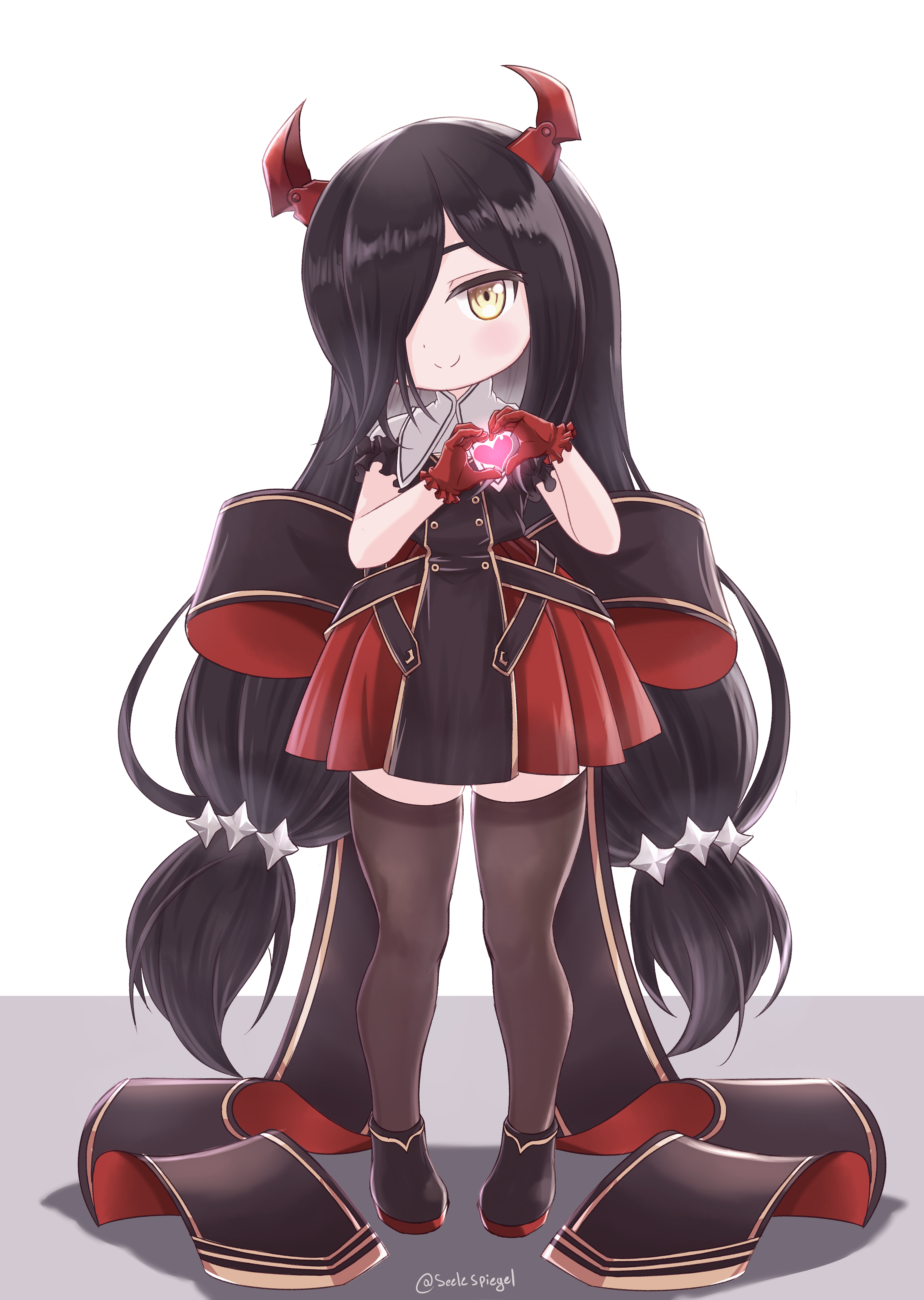 1girl absurdres aged_down azur_lane black_footwear black_hair black_thighhighs closed_mouth hair_over_one_eye hands_up heart heart_hands highres horns light_blush little_friedrich_(azur_lane) long_hair looking_at_viewer low_twintails red_horns smile solo takkikun thighhighs twintails very_long_hair yellow_eyes